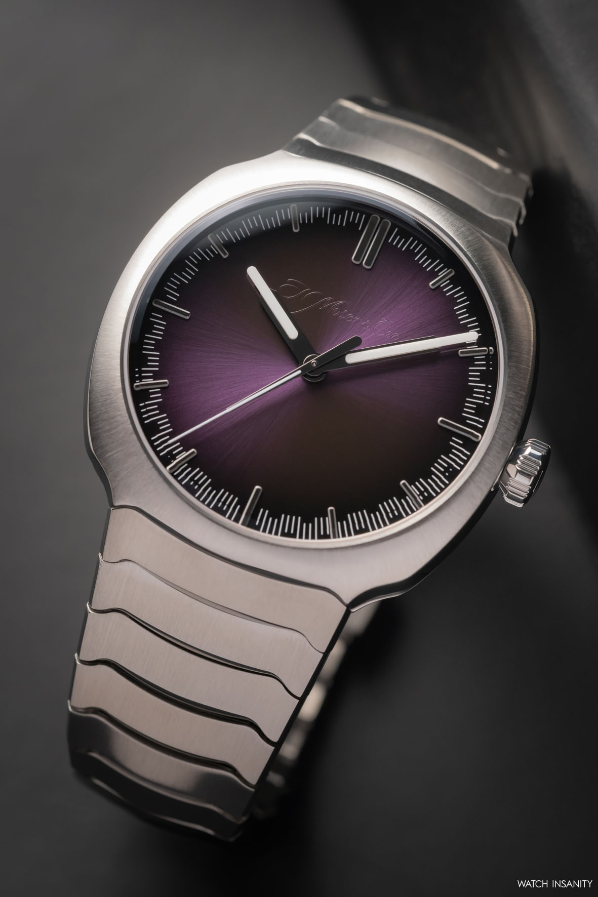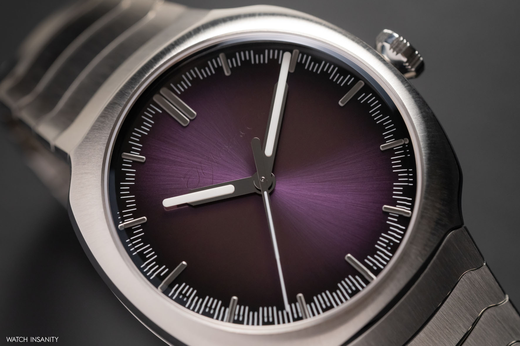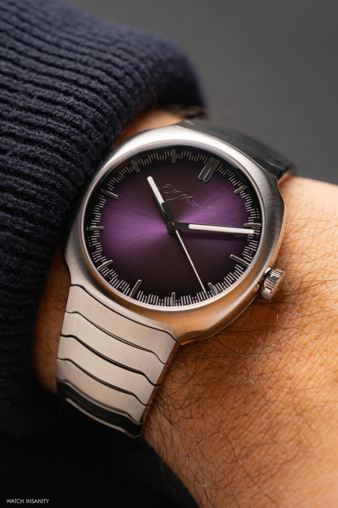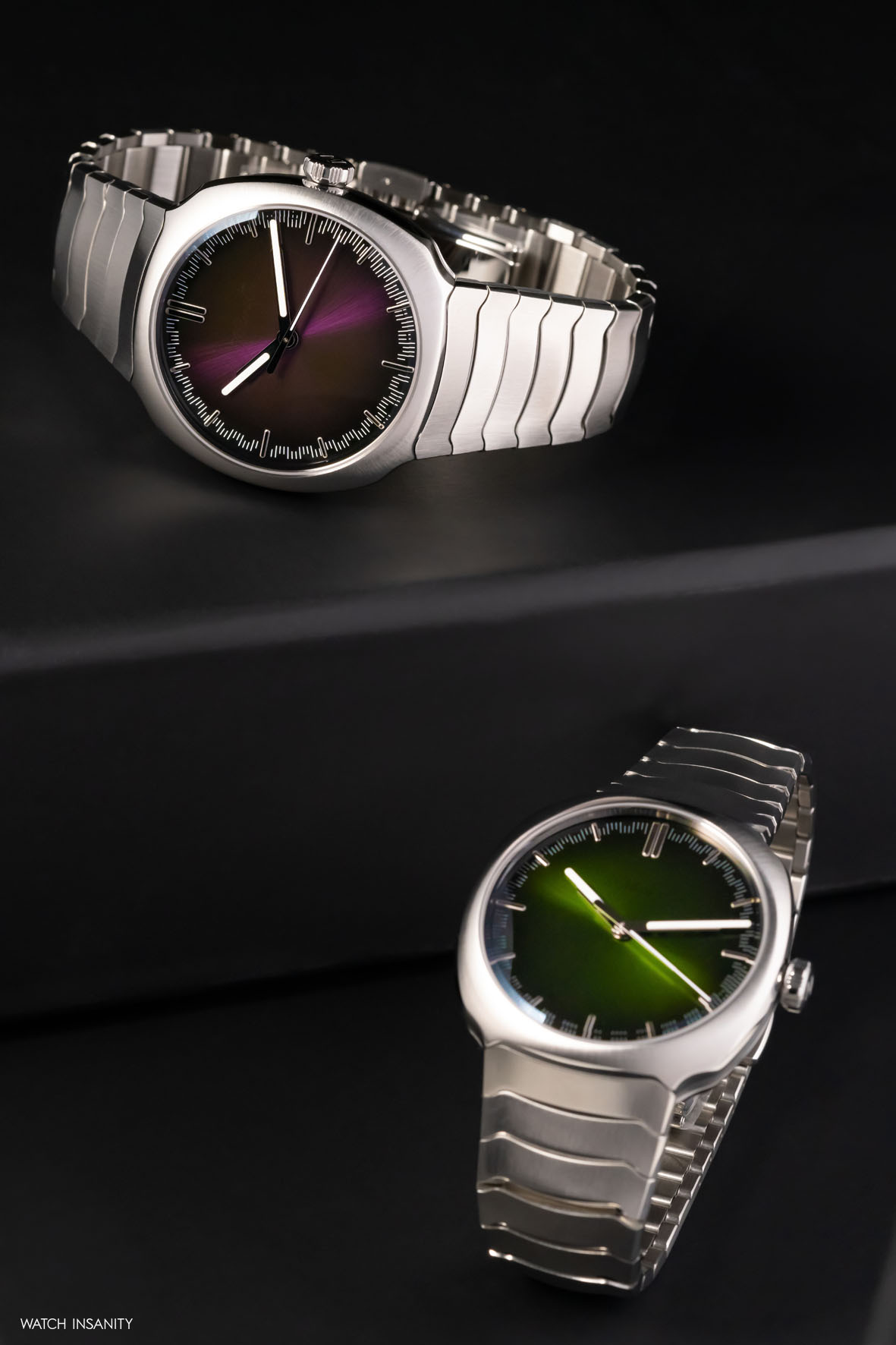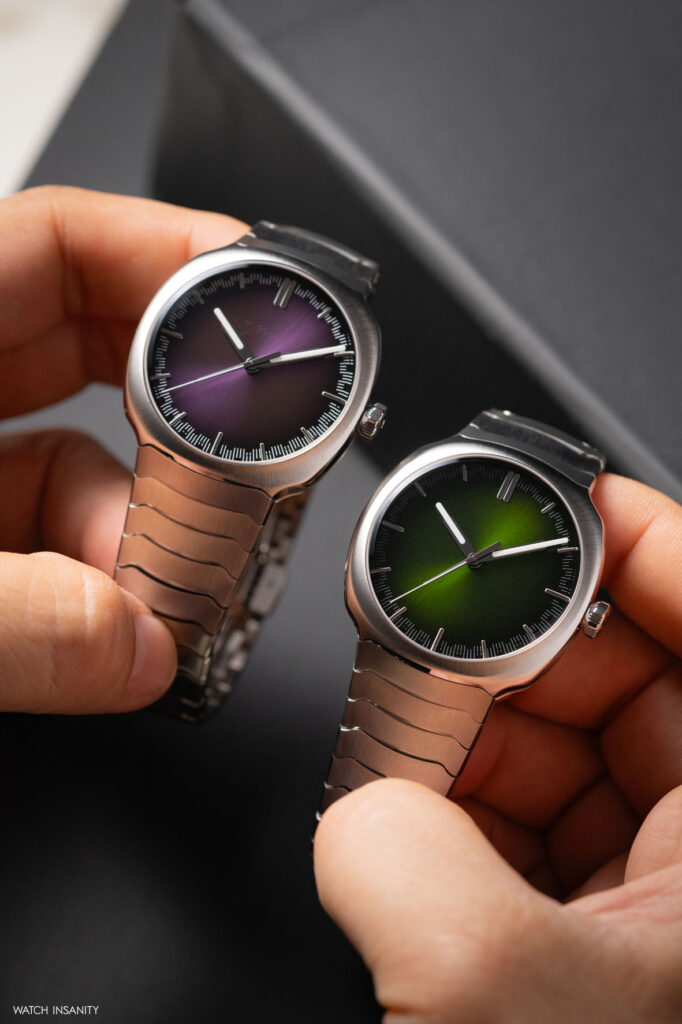 Rispetto al primo Streamliner Centre Seconds Matrix Green a tre lancette del 2020, il Centre Seconds Matrix Green del 2024 e il Purple Haze sono orologi raffinati e aggiornati. Uno degli elementi estetici che caratterizza le nuove referenze è il logo in lacca trasparente, che è visibile solo quando si osserva il quadrante da particolari angolazioni. Una scelta che risponde a uno dei capisaldi della filosofia di H. Moser & Cie., ossia il fatto che il prodotto viene prima del brand e quest’ultimo, quindi, non ha necessità di essere evidenziato. Design, finiture, materiali devono essere in grado da soli di far capire, all’occhio dell’appassionato, da quale manifattura è uscito quell’orologio. Insomma, «dimmi che è un Moser senza dirmi che è un Moser».