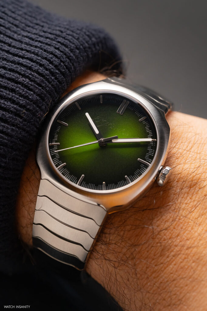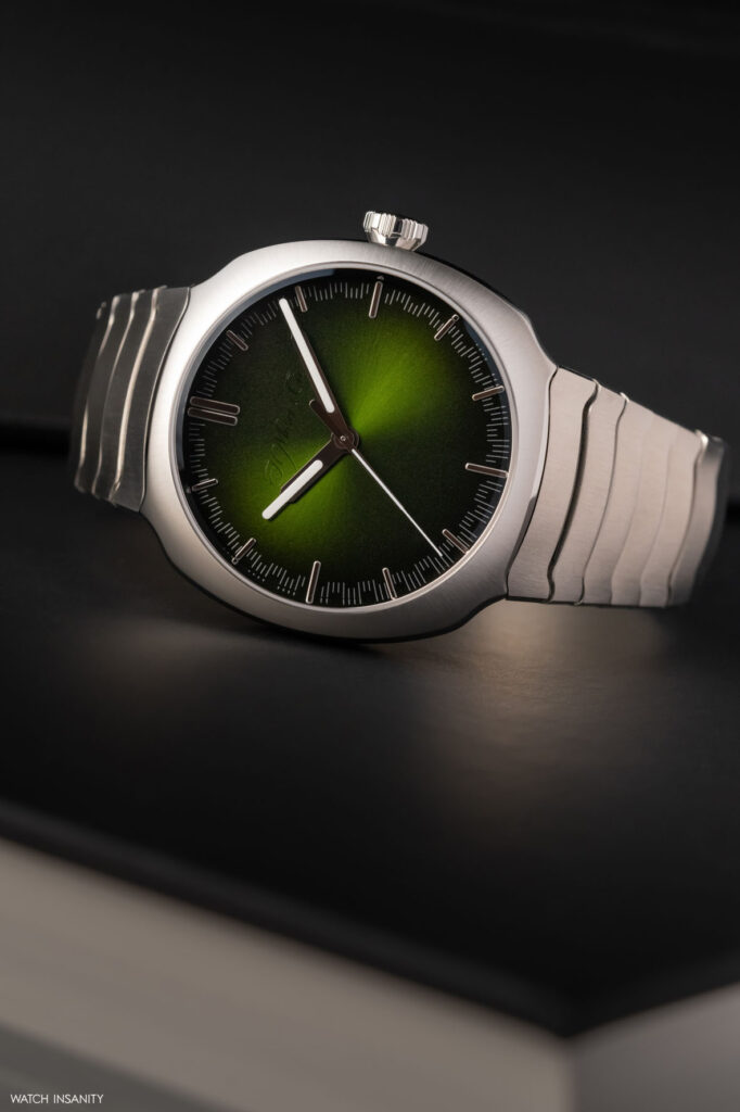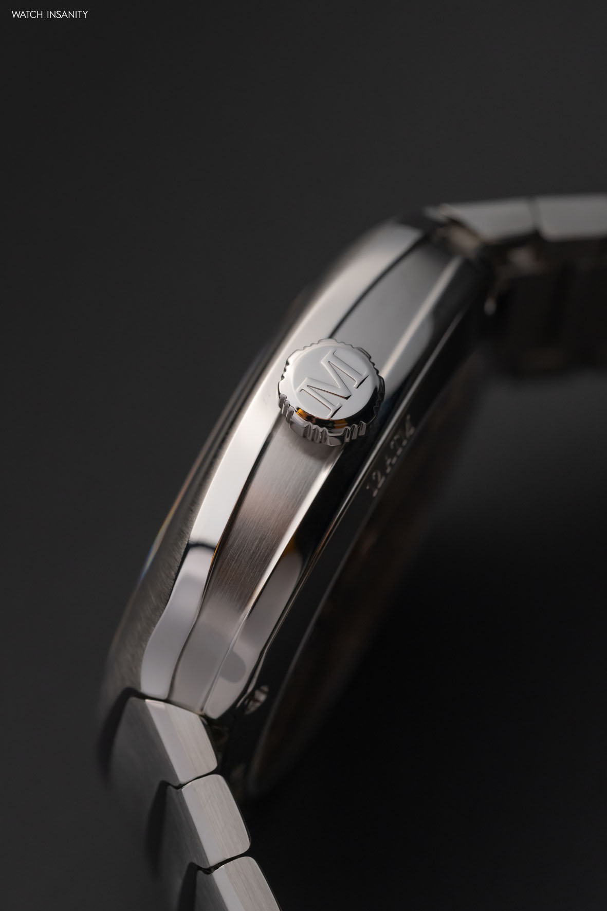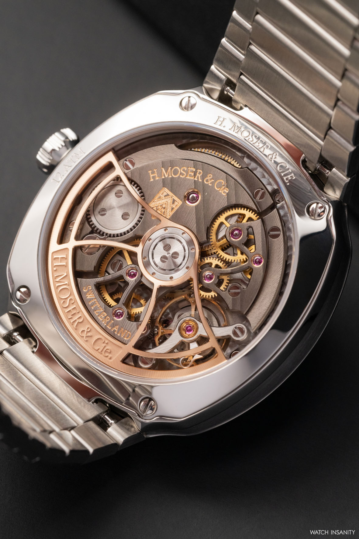 In sostanza, rispetto alle referenze di quattro anni fa, è cambiato poco o nulla. Ciò che è rimasto invariato, principalmente, sono le proporzioni snelle, fluide ed equilibrate che danno vita a un orologio molto armonico, nelle sue dimensioni ideali di 40 mm di diametro per 12,1 mm di spessore. Merito principalmente della cassa in acciaio senza anse, a forma di cuscino, impermeabile fino a 12 bar, e del bracciale in acciaio integrato: due firme estetiche della collezione che, davvero, ci dicono che l’orologio è un Moser senza dirci che è un Moser.