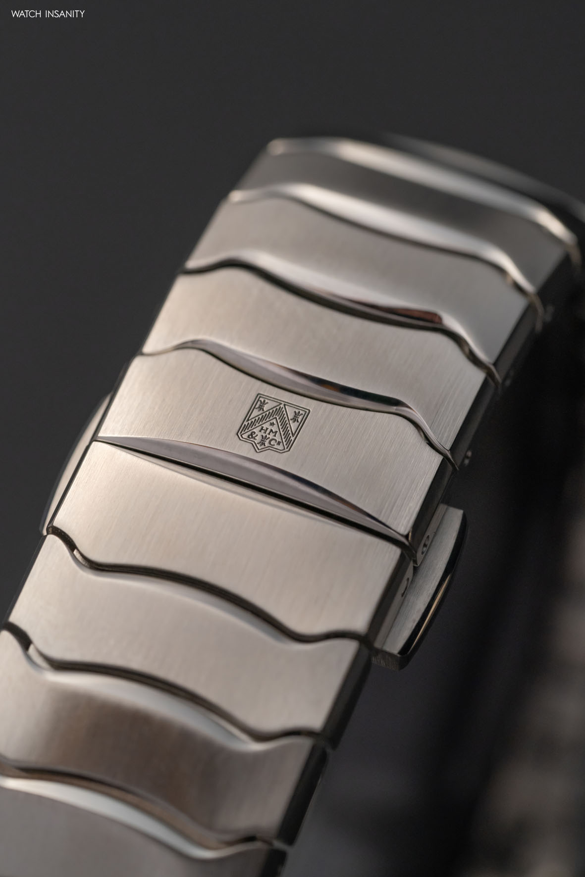 Gli Streamliner Centre Seconds Matrix Green e Purple Haze presentano una carrure incavata e forme satinate sui lati. L’impiego di superfici sia spazzolate sia lucide sottolinea il design fluido della collezione, se vogliamo insolito ma allo stesso tempo rassicuranti; è infatti tipico delle forme sinuose l’essere in un certo senso rilassanti tanto alla vista quanto al tatto. Una fluidità di forme che si ritrova nel vetro zaffiro bombato e nel bracciale arcuato e rastremato che, insieme alle proporzioni della cassa, dà un comfort ottimale al polso. In particolare, il bracciale dello Streamliner è esso stesso un complesso lavoro di architettura, grazie a una costruzione che combina linee organiche e maglie ondulate, con finiture verticali spazzolate e smussi lucidi.