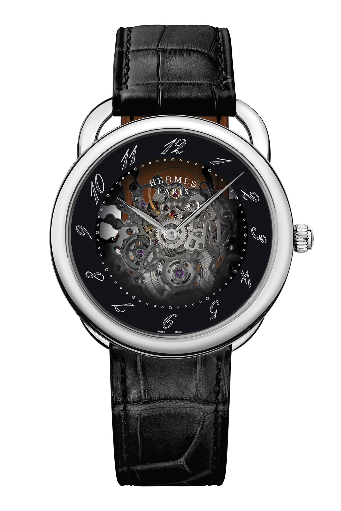 Arceau Squelette è completato da un cinturino in alligatore nero, realizzato dagli artigiani di Hermès Horloger, come anche la cassa e il quadrante. (Prezzo € 6.950)