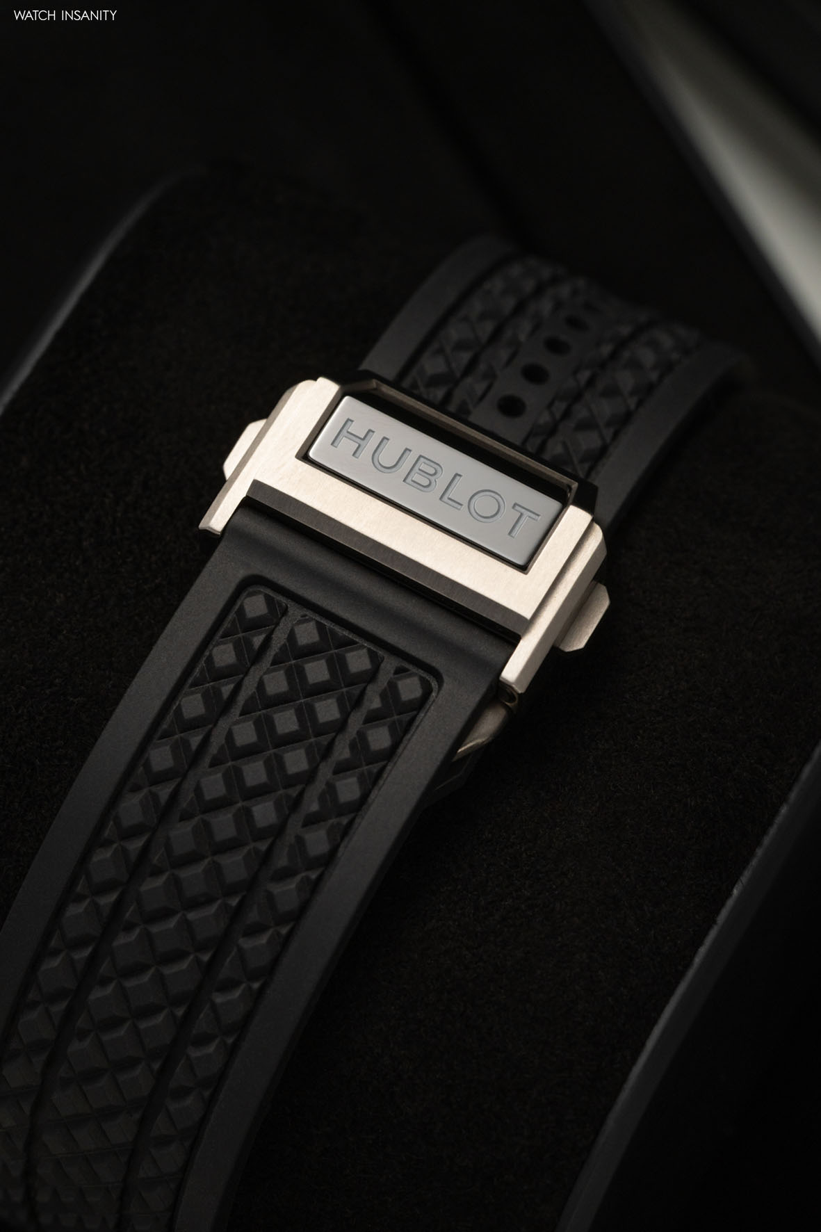 Le anse della cassa sono dotate del sistema proprietario di Hublot One Click, che consente lo sgancio rapido e la sostituzione del cinturino. In questo caso si tratta del classico cinturino strutturato di Hublot, che ha la fibbia in ceramica nera e in titanio, come la cassa. Questo orologio è in edizione limitata di 500 pezzi, a un prezzo di 21.600 euro.