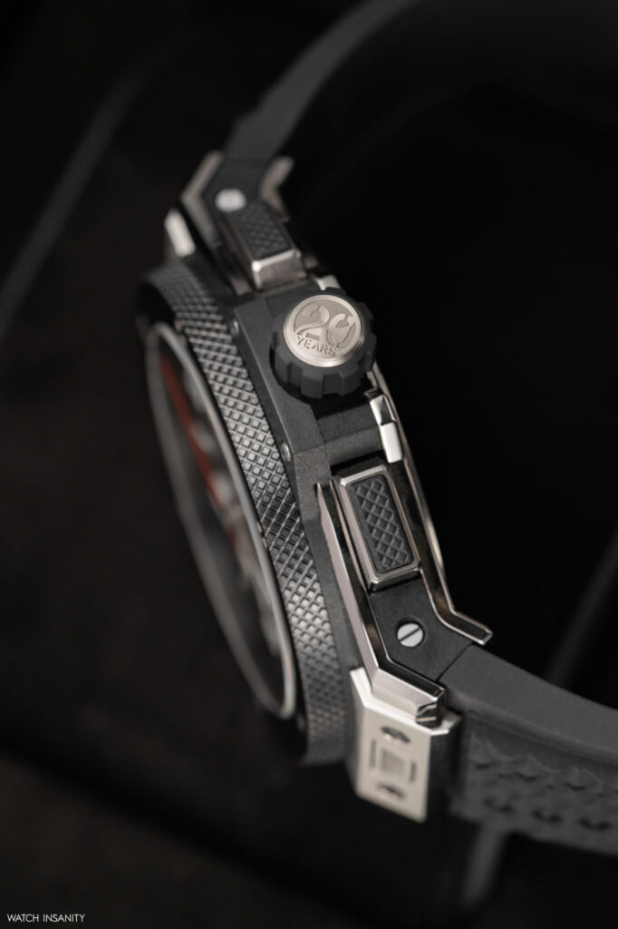 L’estetica è quella classica, appunto, nella quale il titanio lucido e satinato della cassa contrasta con energia con gli inserti in ceramica nera della carrure e, soprattutto, con l’imponente lunetta. È anch’essa in ceramica e si caratterizza per il fianco decorato da un motivo strutturato, a rete, che prova ad alleggerirne la presenza alla vista. Le classiche sei viti in titanio a forma di H la fissano saldamente alla cassa.
