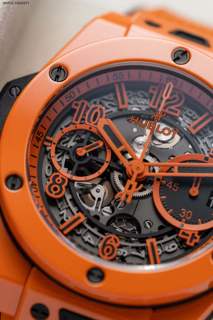 Per ottenere questo materiale, arancione nel caso del Big Bang Unico Orange Ceramic, la principale innovazione riguarda una combinazione di pressione e calore che sinterizza la ceramica senza bruciare i pigmenti. Infatti, se la ceramica colorata sembra semplice da produrre, il processo che consente di avere un materiale altamente resistente in colori vibranti deve vincere una lunga serie di sfide, a partire proprio dal calore estremo. A causa sua, molti tipi di coloranti e pigmenti di solito impiegati per ottenere determinate cromie si bruciano durante il processo di produzione, creando un materiale dai colori spenti, a volte anche a chiazze, anziché con colori vibranti, uniformi e saturi.