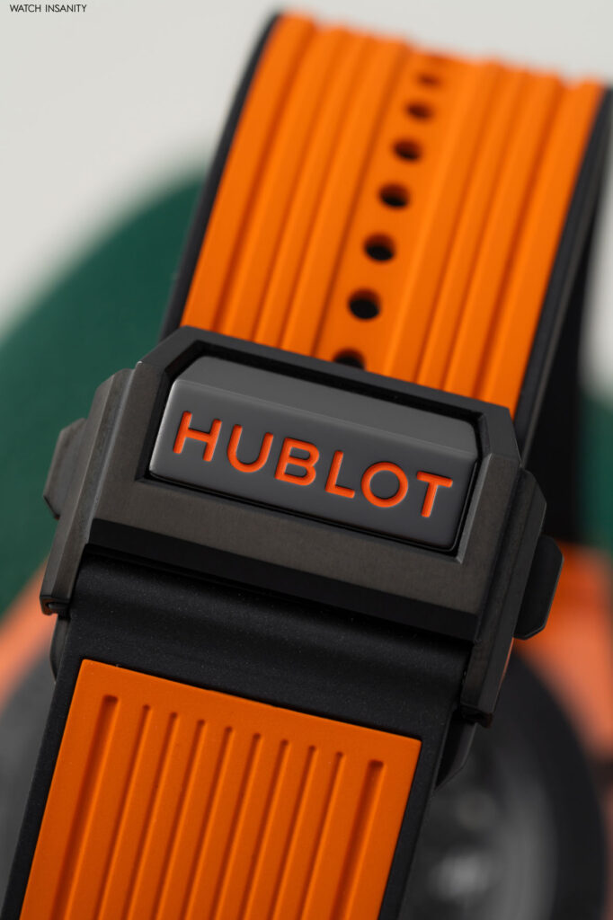Si tratta sostanzialmente di un classico Big Bang Unico, con le caratteristiche che ben si conoscono. Cassa da 42 mm di diametro per 14,5 mm di spessore, impermeabile fino a 10 bar. Lunetta in tinta fissata alla carrure dalle 6 viti funzionali in titanio con testa ad H. L’arancione vibrante della ceramica lucidata a specchio è interrotto da una carrure intermedia in ceramica nera microsabbiata che ha quattro sporgenze. Due piuttosto discrete, a ore 6 e a ore 12, servono ad agganciare il cinturino, facilmente sostituibile grazie al sistema “One Click”, brevettato da Hublot; la sporgenza a ore tre, ben pronunciata, ha la funzione di proteggere la corona e i pulsanti cronografici, quella a ore nove mantiene la simmetria del Big Bang Unico Orange Ceramic.