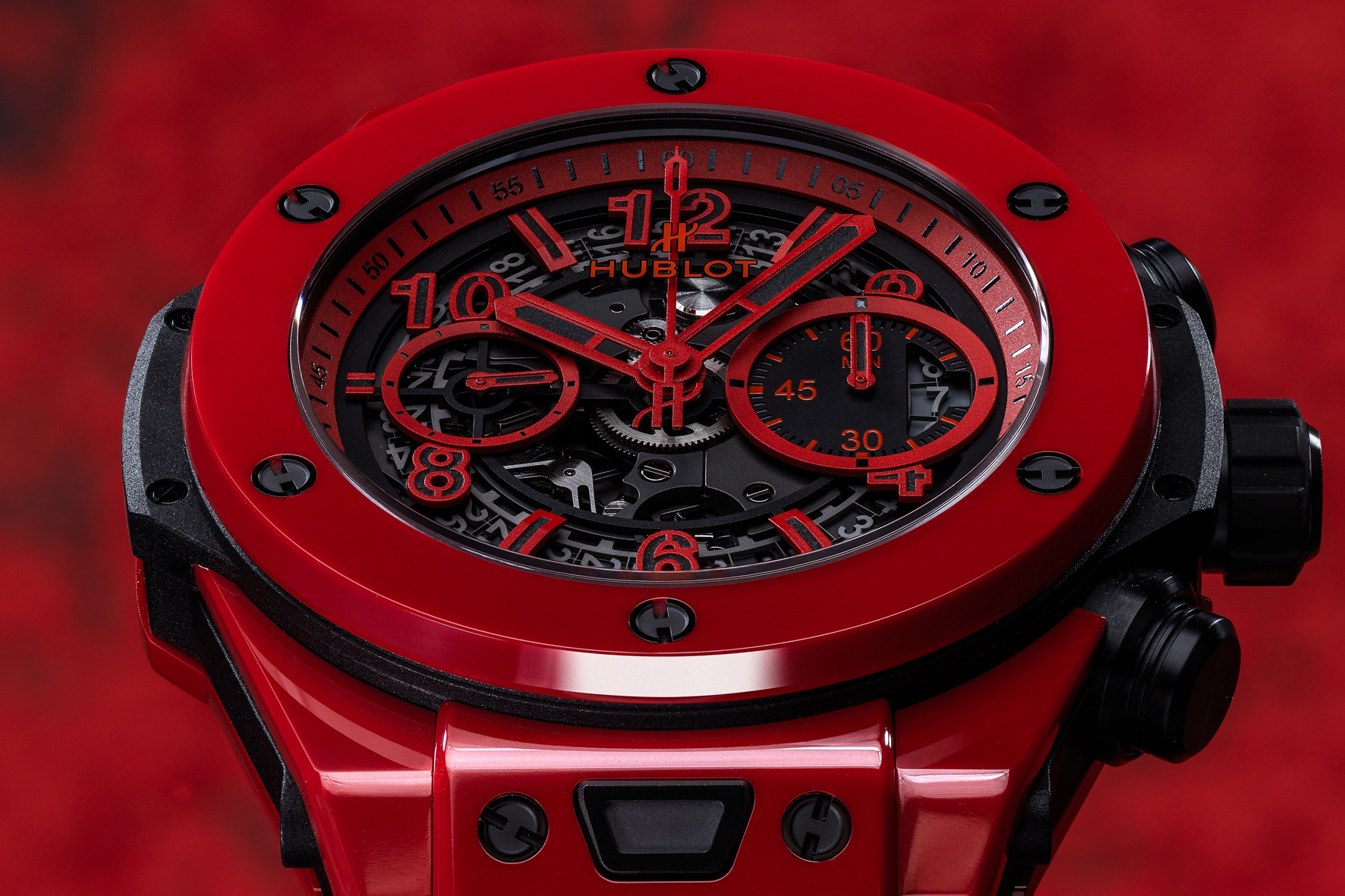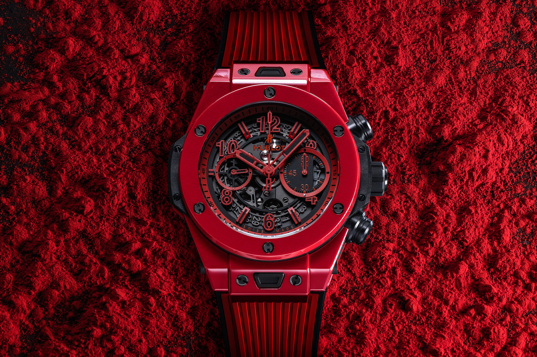 In edizione limitata di 500 esemplari, è dotato di cassa da 45 mm e lunetta realizzate nella ceramica rossa brevettata da Hublot con finitura lucida. Rehaut, indici, contatori dei minuti e dei secondi, numeri arabi e lancette sono tono su tono, nello stesso rosso, e rivelano per contrasto, sotto il quadrante in zaffiro, la meccanica del movimento di manifattura Unico HUB124 e la sua ruota a colonne posizionata lato quadrante. Il suo total look è completato da un cinturino in caucciù rosso foderato strutturato. (Prezzo CHF 24.900)