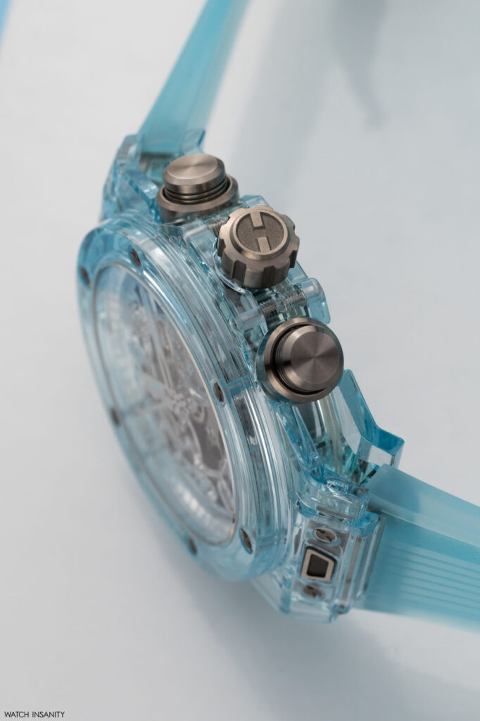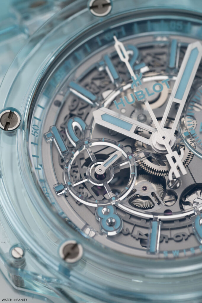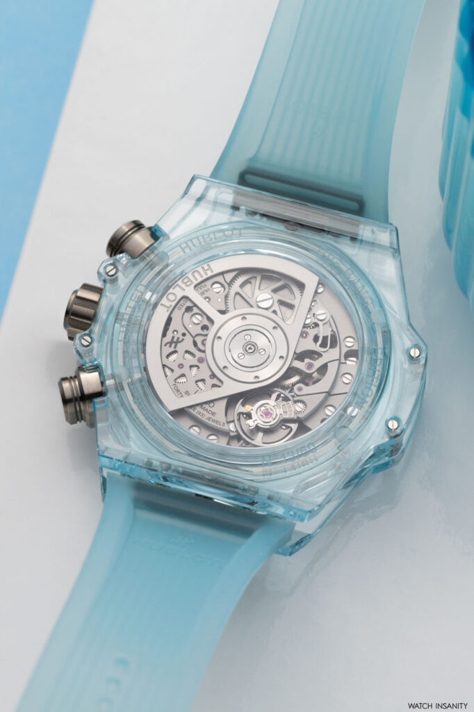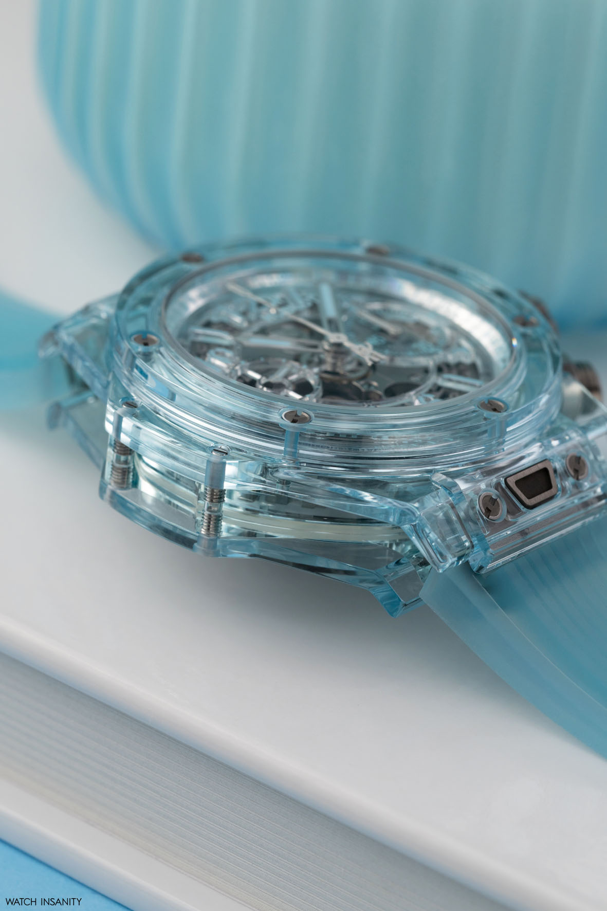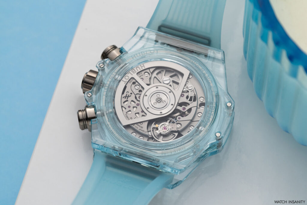 Da un punto di vista estetico e meccanico si tratta di un Big Bang Unico come lo conosciamo. La differenza con gli altri, è evidente, sta nel colore e nel materiale. La cassa è un monoblocco di zaffiro da 44 mm di diametro per 14,5 mm di spessore, impermeabile fino a 5 bar. Bagno in mare sì, per i tuffi meglio fare attenzione. Lo zaffiro azzurro acqua si trova anche sulla lunetta – con le classiche sei viti con testa ad H – e sul fondello, che è trasparente.