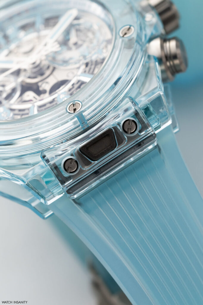 Per il cinturino è stato scelto il classico strutturato trasparente e foderato. Il colore azzurro acqua è perfettamente in tinta con quello della cassa, una cosa per nulla banale. Come non è banale il fatto che questo colore dovrebbe resistere nel tempo alla luce e all’usura, evitando di scolorire. Non ci sono altri cinturini in dotazione, ma attraverso il sistema brevettato One Click può essere sostituto rapidamente con uno delle decine disponibili da Hublot. La fibbia è una deployante in titanio.