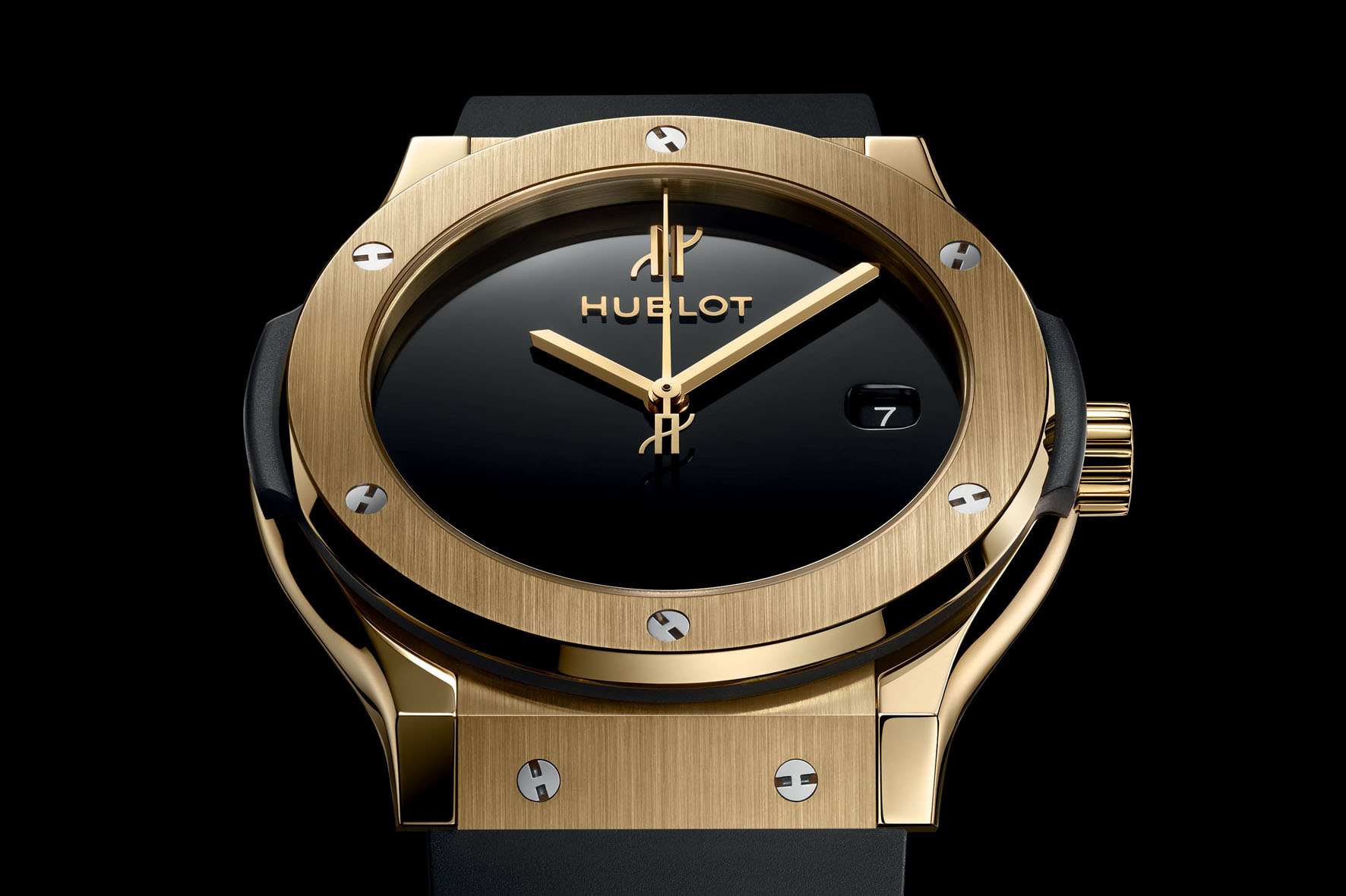Il quadrante nero laccato lucido esibisce una straordinaria sobrietà, lasciando spazio solamente alle lancette sfaccettate, la data a ore 3, all’applique Hublot e al logo H. La cassa da 45 mm realizzata in oro giallo, titanio o ceramica nera include le famose viti a forma di H e fondello in vetro zaffiro, il tutto completato dall’immancabile cinturino in caucciù, facilmente regolabile al polso, che offre un grande comfort grazie alla tripla chiusura deployante.