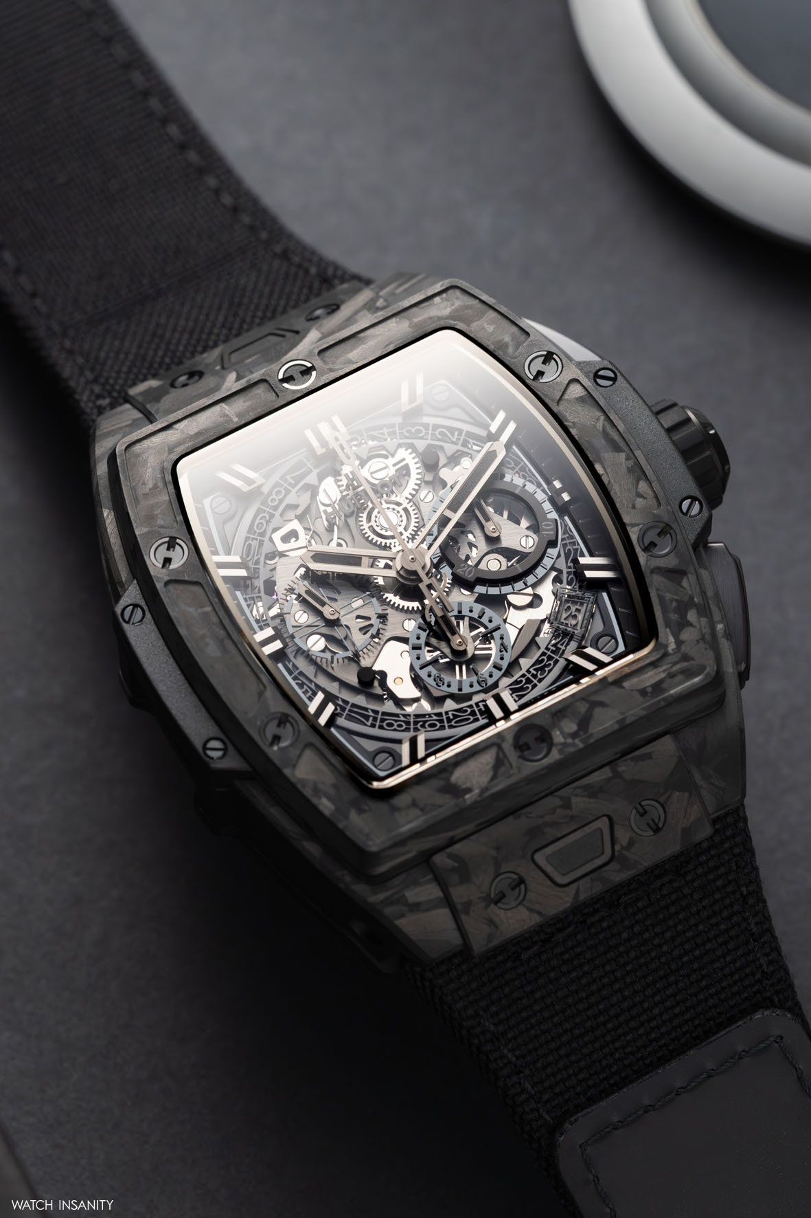 Proprio questo particolare tipo di carbonio è il punto di partenza migliore per conoscere l’anima dello Spirit of Big BangFrosted Carbon. Fino a oggi, Hublot lo aveva riservato a due sole referenze di grandi complicazioni, lo Spirit of Big Bang Tourbillon e, all’inizio del 2025, il Big Bang MECA-10. Entrando ora in collezione corrente, rende maggiormente accessibile quello che è uno dei migliori esempi dell’arte della fusione, che è il pay-off del marchio di Nyon. Perché la cassa di questo cronografo ha pochi paragoni in orologeria dal punto di vista tattile e visivo.