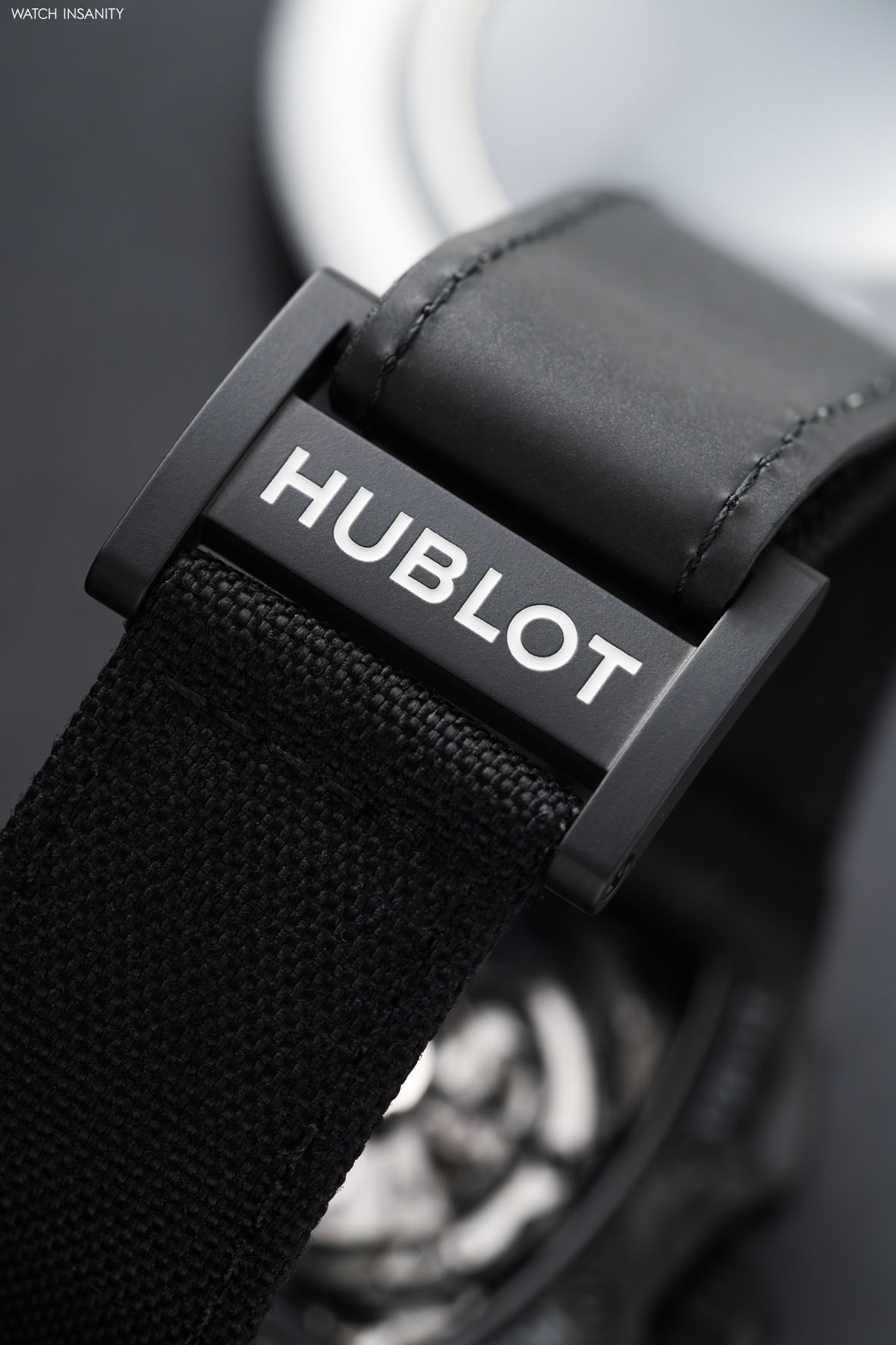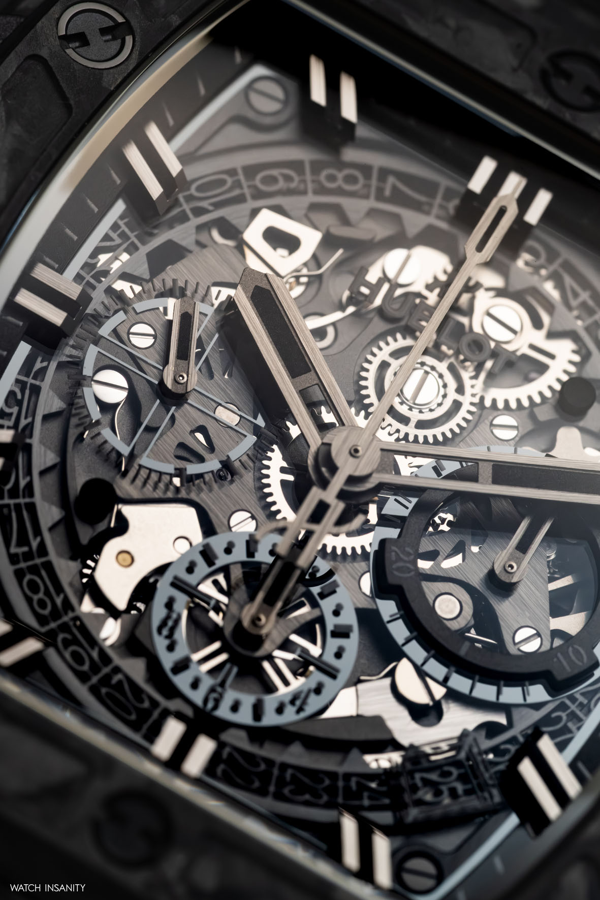 Anche se i contatori del cronografo sono un po’ “annegati” nel mix tra scheletratura e look scuro, esteticamente sono ben bilanciati, con la classica disposizione tricompax che vede a ore 3 il contatore dei 30 minuti, a ore 6 quello delle 12 ore e a ore 9 quello dei secondi continui. L’assenza della scala tachimetrica, come nelle altre referenze della collezione, ci ricorda che anche lo Spirit of Big Bang Frosted Carbon è in fin dei conti non tanto un “tool watch” quanto un “cool watch”. Sotto la luce giusta, i ponti e i componenti in acciaio mostrano un contrasto accattivante, che interessa anche le superfici a specchio, che sembrano lucidate di nero.