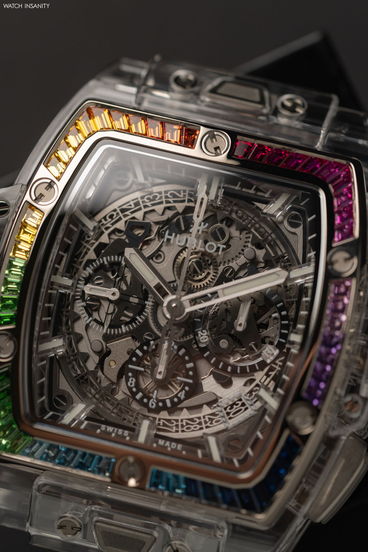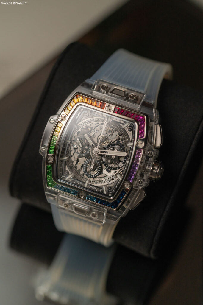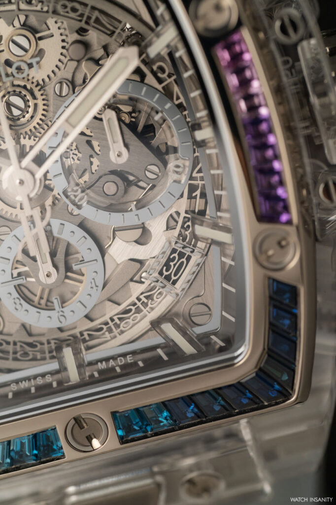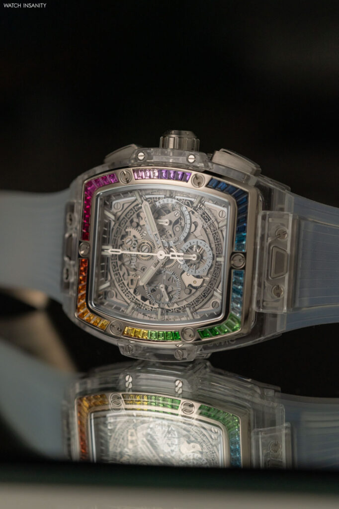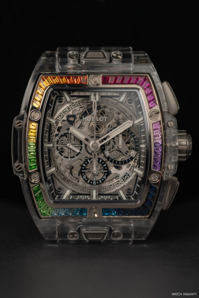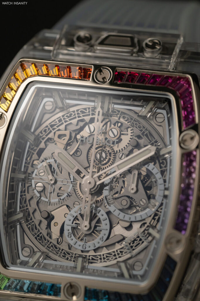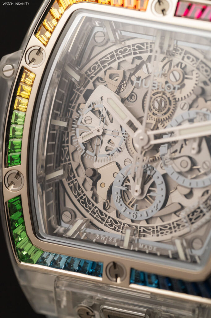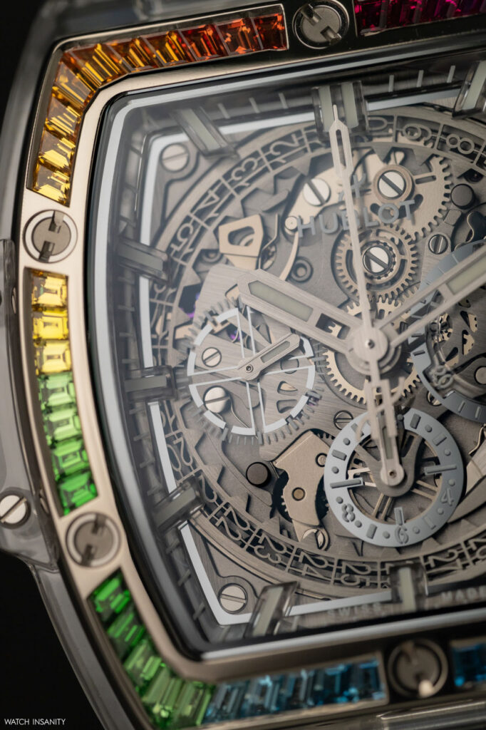 Come è facile immaginare, nell’Hublot Spirit of Big Bang Sapphire Rainbow è presente tutto questo. Qui, il lavoro sull’arcobaleno è limitato alla lunetta lucida in oro bianco 18 carati, che è incastonata con 54 pietre colorate taglio baguette. La loro palette cromatica va dal rosso fuoco al viola, dal blu scuro al verde bosco, in una sequenza interrotta solo dalle classiche 6 viti a forma di H che fissano la lunetta alla carrure in maniera indissolubile.