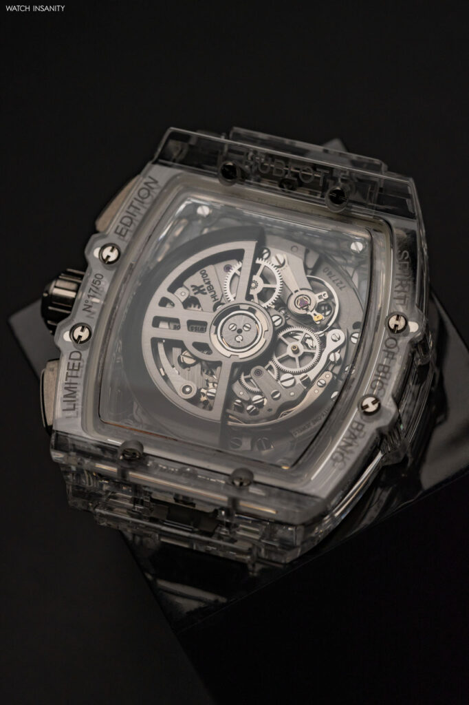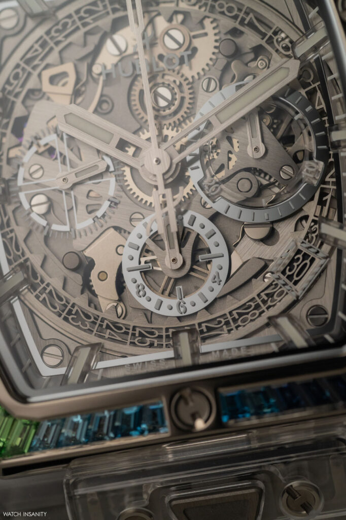 Nel complesso l’orologio risulta leggero alla vista. Un risultato che è diretta conseguenza della trasparenza d’insieme, data non solo dalla cassa in vetro zaffiro ma anche dal quadrante e dal fondello che sono nello stesso materiale. La trasparenza del quadrante consente la visione del movimento, appena ostacolata dalle lancette rodiate e satinate e dai contatori cronografici. Questi ultimi tendono a essere un po’ fagocitati dall’architettura del calibro HUB4700 visibile sotto al quadrante, ma è il prezzo da pagare di fronte a tanta luminosità. Più evidente il cerchio del datario, che scorre al di sotto degli indici applicati e nel quale il giorno corrente è visualizzato in una finestrella a ore 4:30.