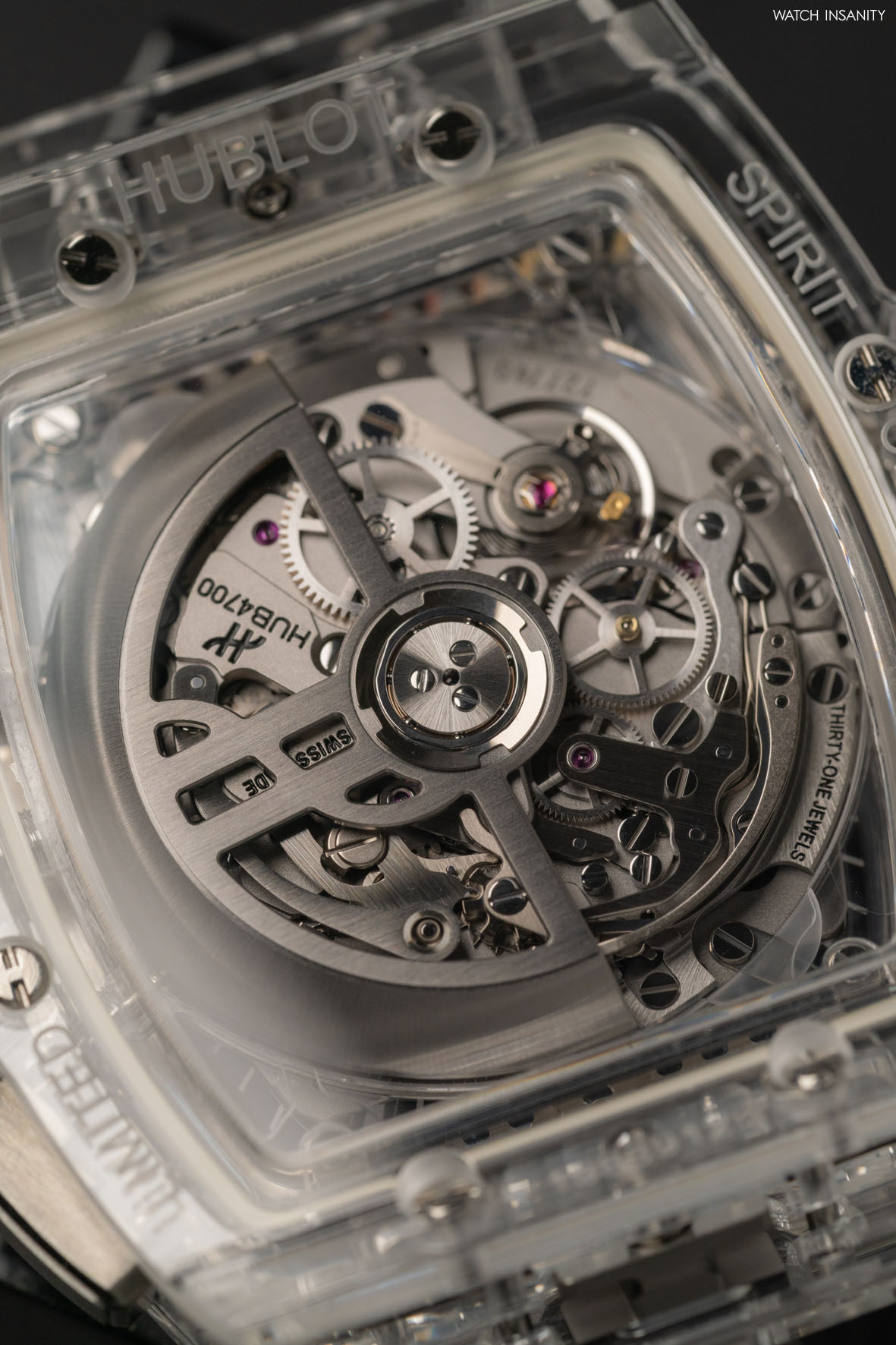Il calibro HUB4700 che anima l’Hublot Spirit of Big Bang Sapphire Rainbow è una delle punte di diamante del marchio di Nyon. È largamente utilizzato nella collezione Spirit of Big Bang, nella quale equipaggia una ventina di referenze, ed è sostanzialmente la versione scheletrata del movimento cronografico El Primero 400 di Zenith, che Hublot ha modificato secondo specifiche proprie.