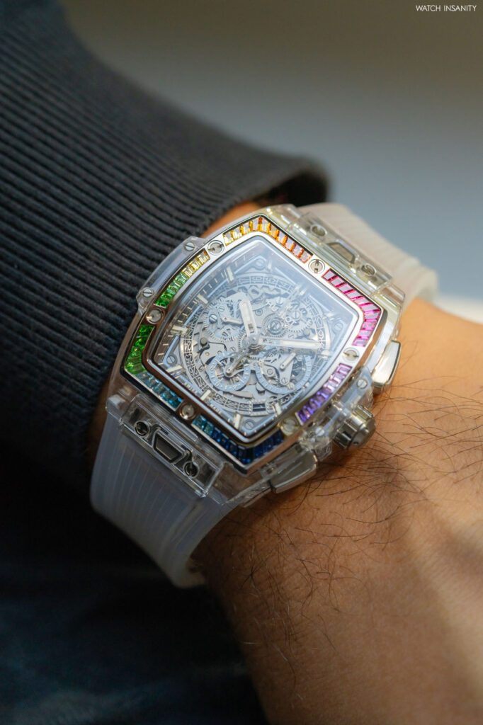 La scelta di circoscrivere l’arcobaleno alla lunetta è funzionale all’obiettivo che Hublot si è data per questo orologio: renderlo il più trasparente e brillante possibile, sacrificando un po’ di show-off a una misurata sobrietà. Non certo nella forma tonneau, quanto nella sensazione di monocromia che il segnatempo dà se visto nel suo insieme. Una sensazione che la lunetta arcobaleno esalta, anziché mortificare.