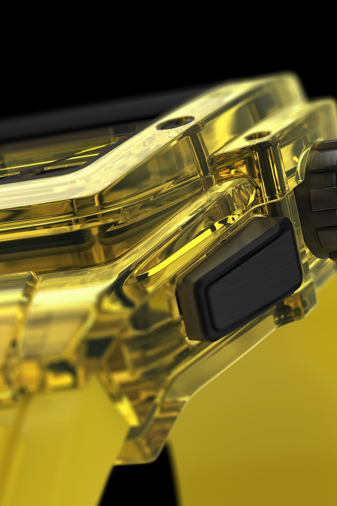 4 blocchi di zaffiro giallo scolpito nella massa, 100 ore di lavoro e una lavorazione 3D per creare l’architettura a botte del nuovo Spirit of Big Bang Sapphire 42mm. Un orologio duro e resistente ai graffi come il diamante (livello 9 sulla scala di Mohs rispetto a 10 del diamante) e leggero come il titanio, 107 grammi al polso. Una trasparenza assoluta vestita dello splendore di un giallo solare che si estende fino al cinturino in caucciù naturale rigato giallo. Unico materiale di contrasto, il titanio in cui sono realizzati i componenti del movimento HUB4700, le viti della cassa, le 6 viti a forma di H della lunetta e la fibbia déployante, la corona ed i pulsanti.