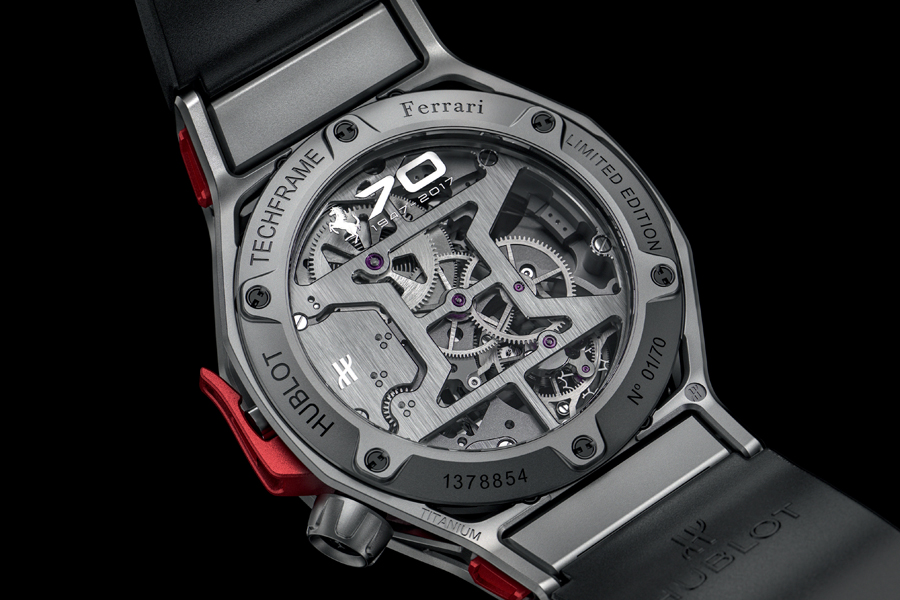 La manifattura Hublot ha ripreso il design da Ferrari applicandovi la propria esperienza nel progettare e produrre orologi, nonché la propria competenza nei materiali, per rendere fattibili questi concetti estetici e tecnici. Il risultato è un telaio della cassa con una struttura modulare dei tre componenti, scheletro intermedio, contenitore e fondello, che è coerente con lo stile ripreso da Ferrari. Disponibile nelle versioni King Gold e titanio, il nuovo Techframe Ferrari 70 Years Tourbillon Chronograph è proposto anche in carbonio PEEK, un materiale multistrato ipoallergenico realizzato in fibre di carbonio particolarmente lunghe, estremamente duraturo e affidabile che rappresenta un elemento essenziale di questa cassa molto aperta. Questa non è l’unica innovazione: i due pulsanti laterali facilitano la sostituzione del cinturino pur garantendo la massima sicurezza. Come tutti i componenti colorati di questo nuovo Techframe, i due pulsanti laterali sono realizzati nel famoso rosso P485 Ferrari. Sul fondello della cassa è incisa la scritta “Limited Edition, n ° XX / 70” mentre lo zaffiro del fondello è decorato con la dicitura “Ferrari 70 Years”.