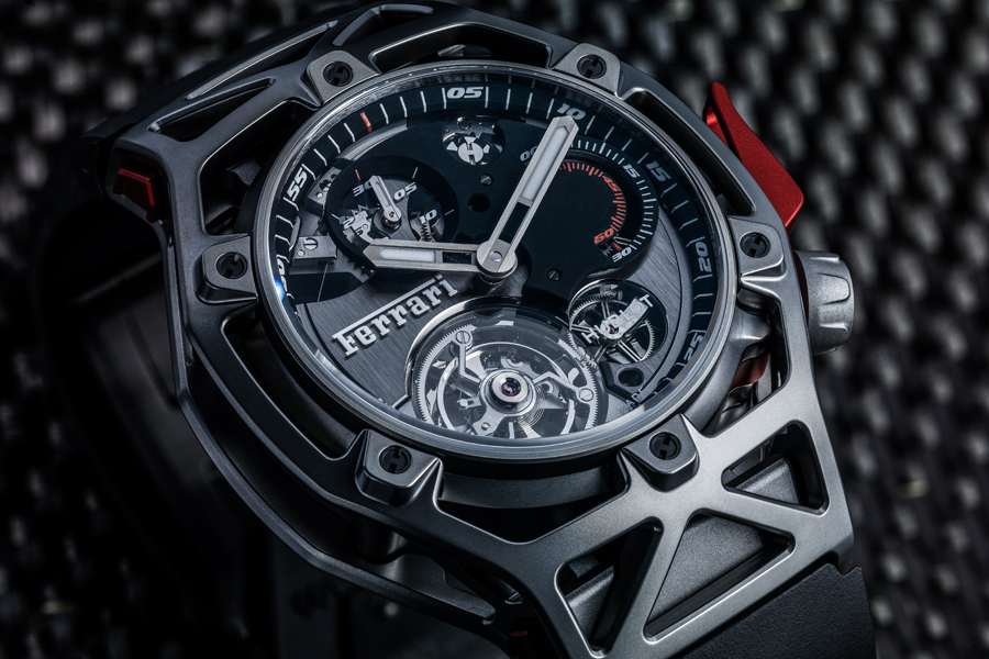 «Lo stile del Techframe Ferrari 70 Years Tourbillon Chronograph esalta le prestazioni dell’orologio e nessun componente è casuale», spiega Flavio Manzoni. Infatti, i contatori del cronografo sono inseriti sulla struttura nera del quadrante offrendo così un’ottima leggibilità. La corona a ore 4, evidenziata da un inserto in titanio PVD nero decorato con il famoso cavallino rampante, riduce al massimo le dimensioni dell’orologio e ne accresce l’aspetto aerodinamico. Infine, il pulsante rosso è posizionato strategicamente per facilitarne l’utilizzo anche durante la guida e ne rende più ergonomico il design.