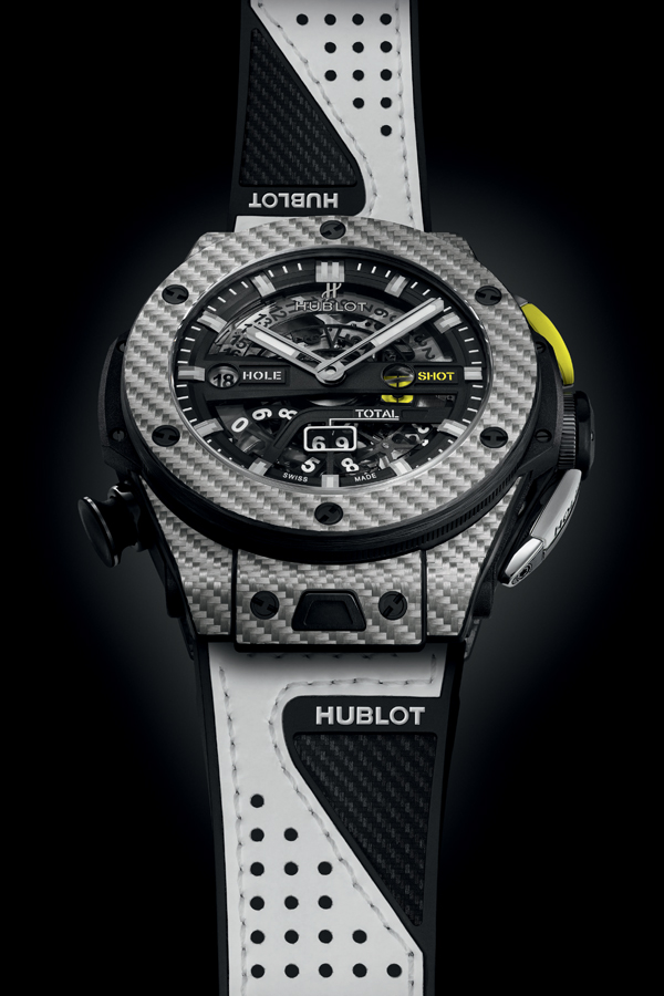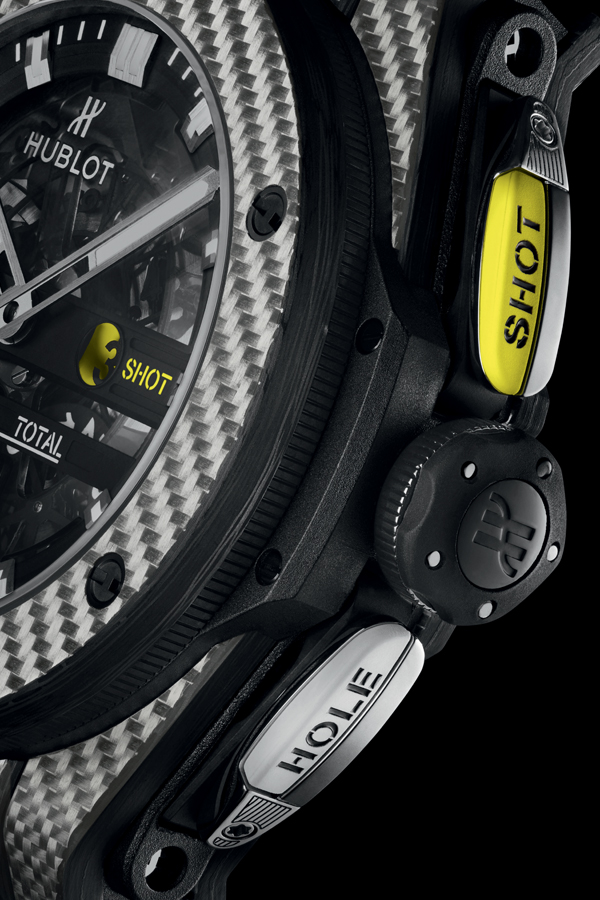 Il Big Bang Unico Golf ha l’aspetto di un cronografo ed è stato concepito come tale. Per il movimento che azzera il meccanismo di conteggio sono stati adottati perni della ruota della massima affidabilità e resistenza. Il pulsante a forma di putter consente di attivare alle 2 il meccanismo che visualizza il numero di colpi e conta i colpi per foro. Il pulsante alle 4 permette di saltare alla buca successiva mentre si riazzera il contatore dei colpi. Il contatore alle 6 visualizza il totale dei colpi giocati e si aggiorna via via che si giocano. Il pulsante alle 8, che prende la forma di un tee, consente di resettare il meccanismo e azzerare i contatori alla fine di una partita. Durante il gioco e per evitare un’attivazione involontaria, questo pulsante può essere bloccato con una semplice rotazione di 45°.