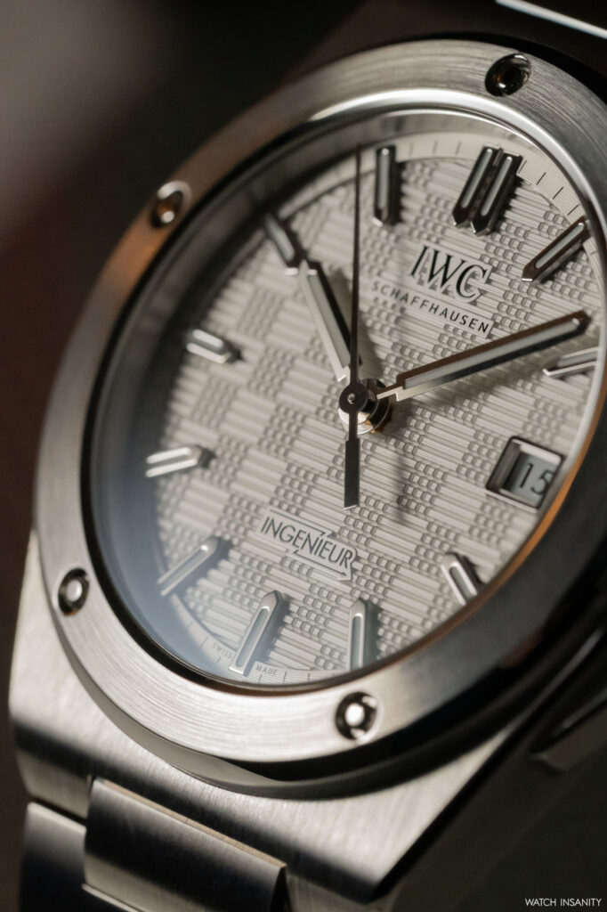 Oltre al bracciale e alla lunetta avvitata, ciò che distingueva l’Ingenieur delle origini era la lavorazione particolare del quadrante. Per il nuovo orologio, IWC ha scelto un particolarissimo motivo a griglia composto da piccole linee sfalsate di 90 gradi l’una rispetto all’altra. Il motivo viene stampato su una superficie di ferro dolce e poi zincato. L’Ingenieur Automatic 40 è disponibile in tre diversi colori di quadrante: nero, argento o Aqua, sui toni del verde-azzurro.