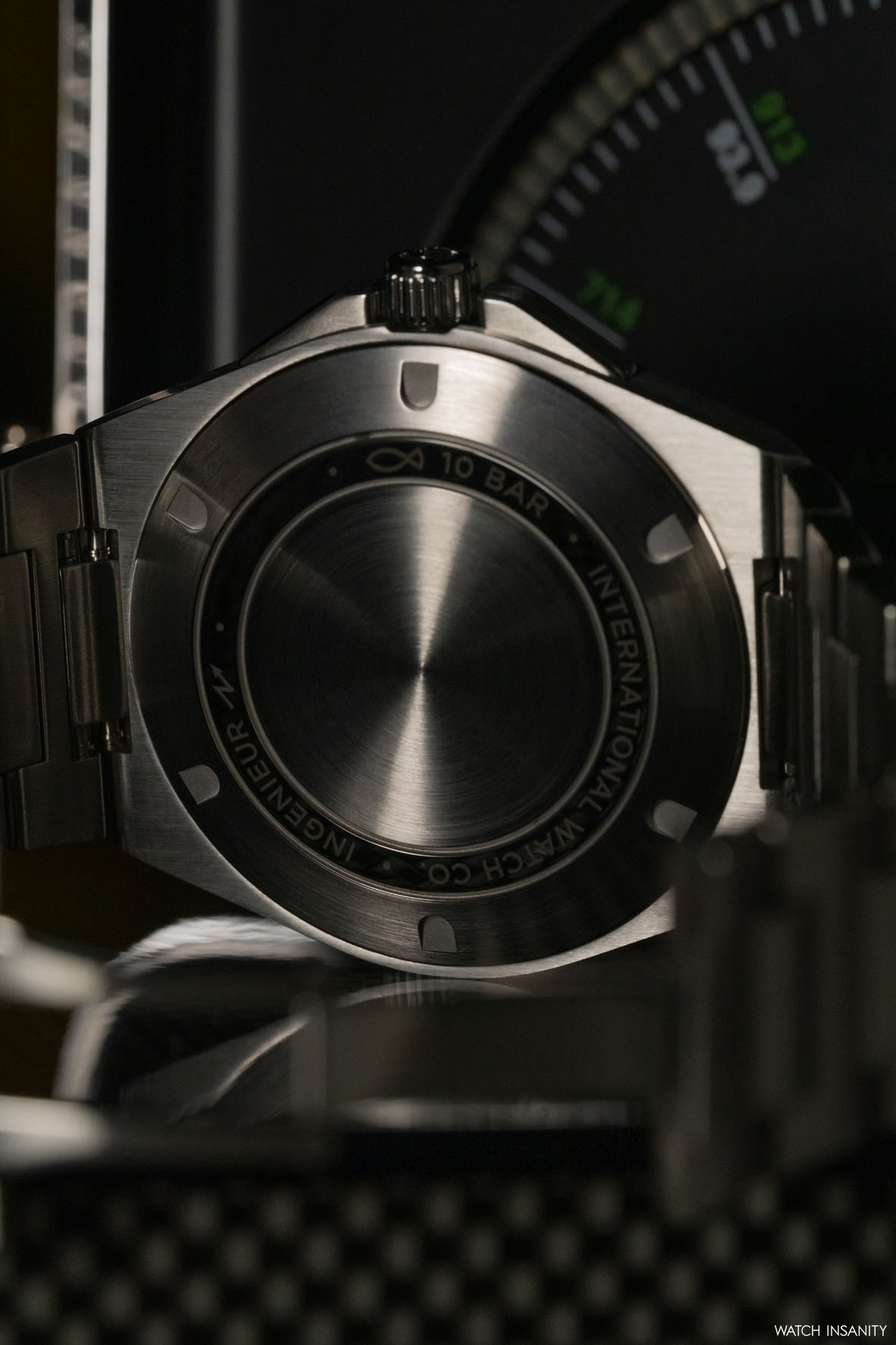 Interessante il lavoro fatto sul bracciale, con le caratteristiche maglie a forma di H. Quelle superiori, dall’attacco delle anse più o meno fino a metà bracciale, non hanno buchi passanti per i perni: una soluzione che dà all’Ingenieur Automatic 40 un tocco di eleganza che ne aumenta ulteriormente la qualità percepita. La chiusura è una deployante a farfalla, che agevola la comodità e contiene lo spessore del bracciale stesso.