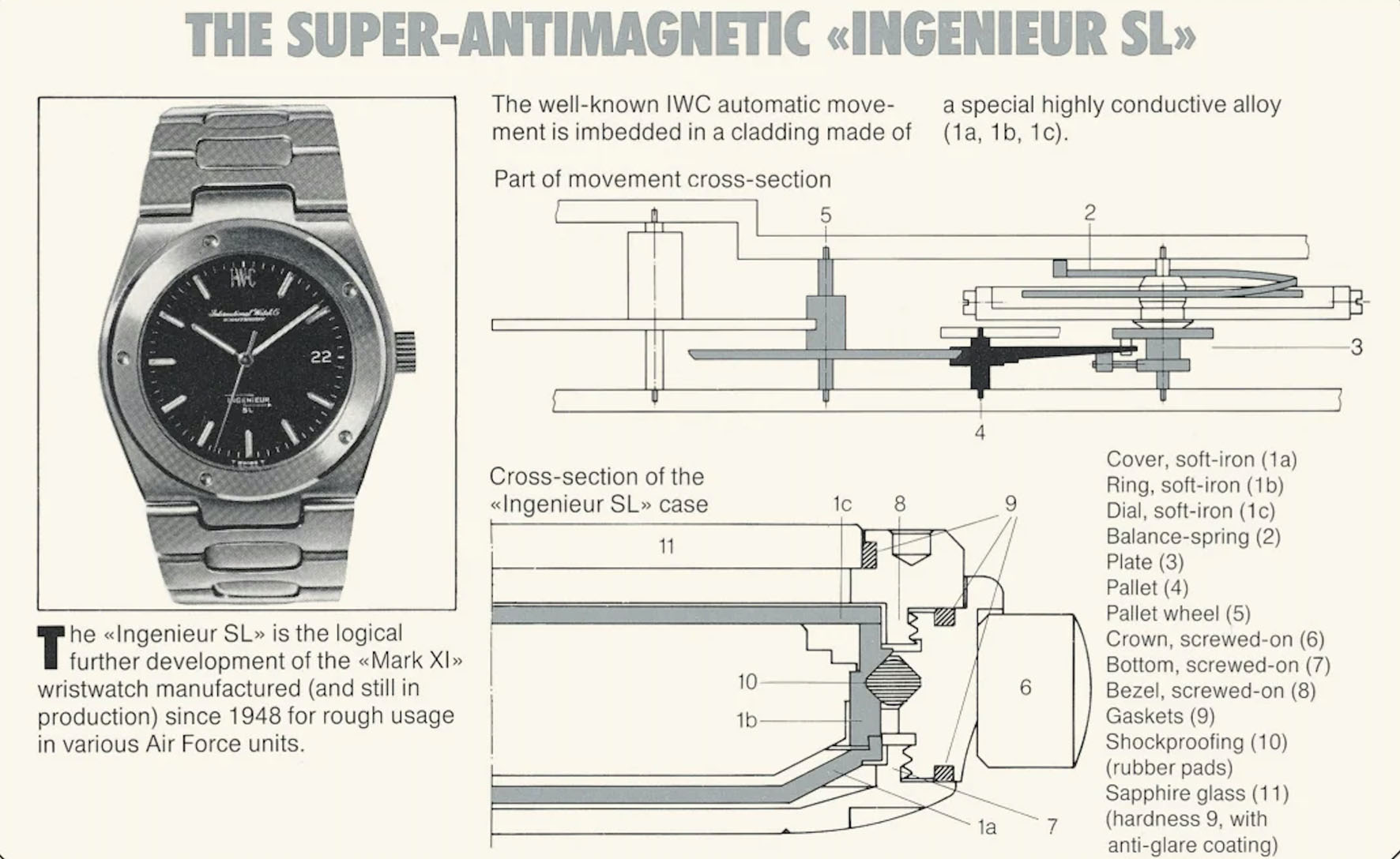 L’antimagnetismo era ottenuto grazie a una cassa interna in ferro dolce a protezione del movimento. Funzionava come una gabbia di Faraday, disperdeva le onde elettromagnetiche all’esterno del calibro, che non ne era influenzato e manteneva così la propria precisione. Un oggetto ideale per i professionisti che lavoravano in ambienti esposti a forti campi magnetici. Nulla di nuovo per IWC, che aveva sviluppato questa tecnologia qualche anno prima per il Mark 11.