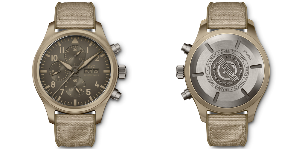 La ceramica color sabbia si ispira al deserto del Mojave, che ospita la Naval Air Weapons Station China Lake, la più grande area terrestre della U.S. Navy. Il colore si abbina perfettamente alle uniformi indossate dai piloti della Marina ed è il risultato di una combinazione di ossido di zirconio con altri ossidi metallici. Il cronografo è alimentato dal calibro di manifattura IWC 69380. Il movimento cronografico con la classica ruota a colonne presenta, oltre alla funzione cronografo, l’indicazione del giorno e della data. Il sistema di carica a cricchetti, che si ricarica su entrambi i lati, assicura un’autonomia di 46 ore.