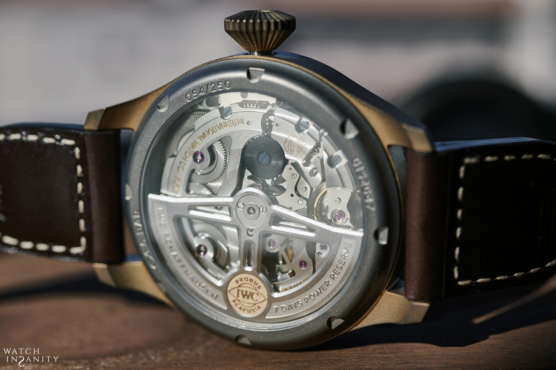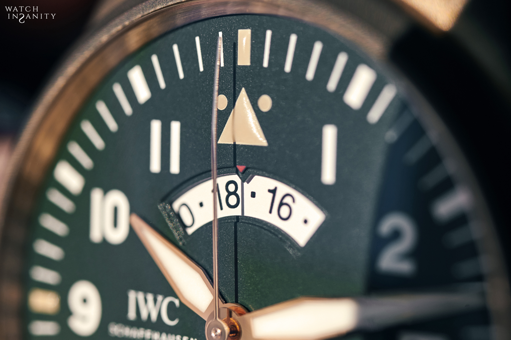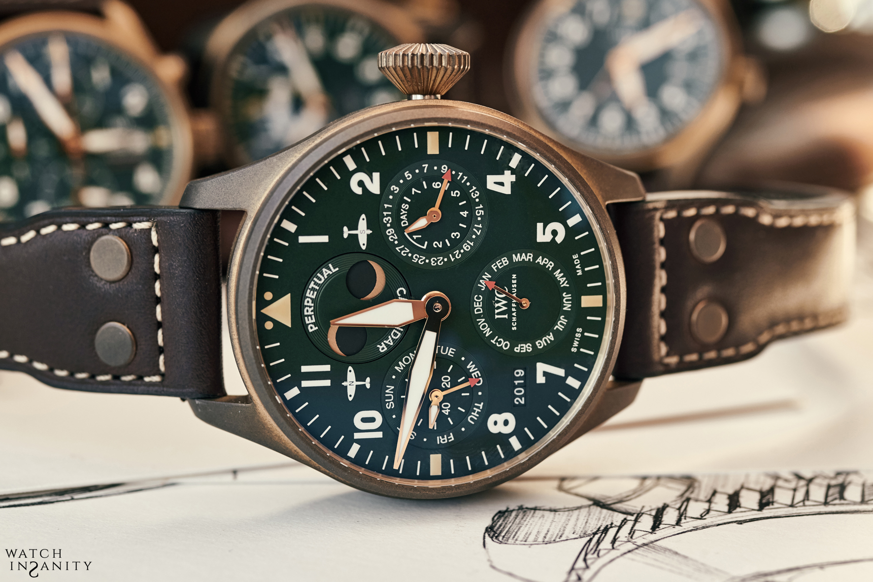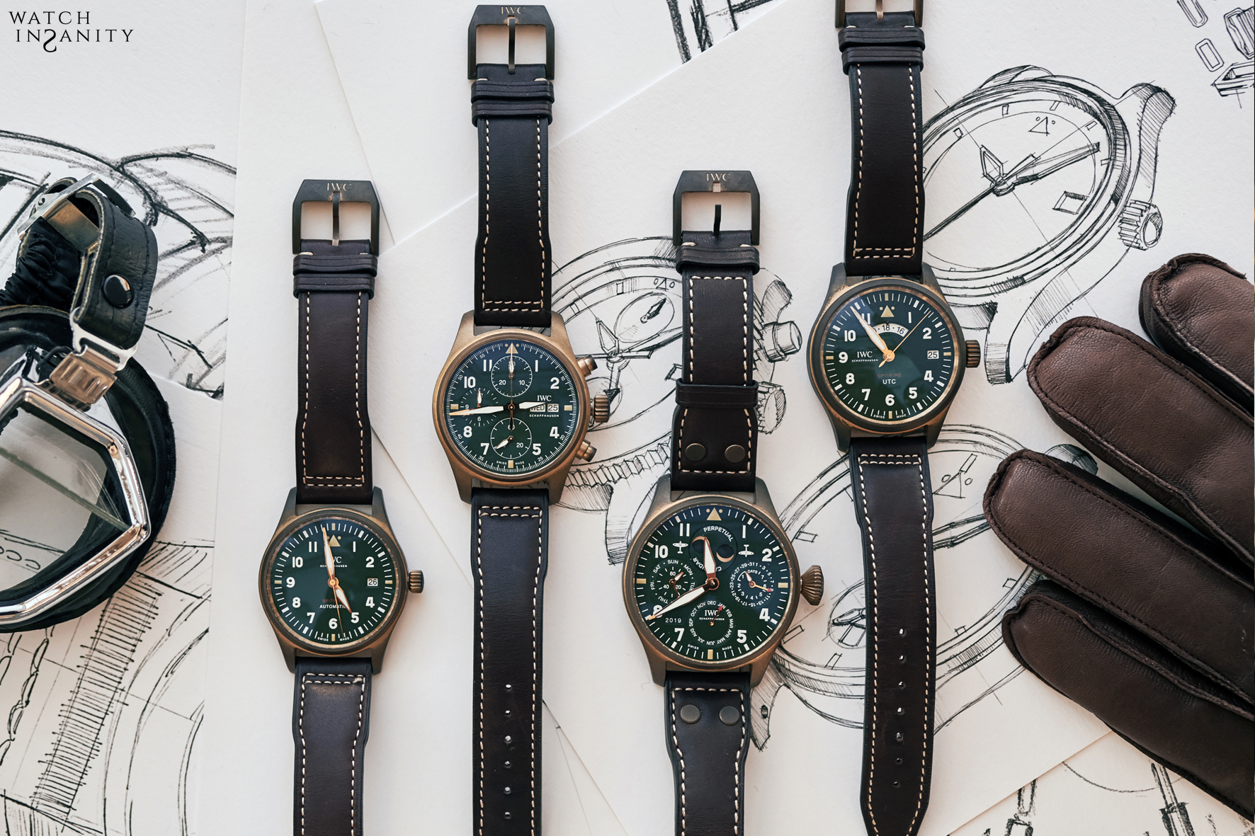Le due referenze (Ref. IW326801 e IW326802) presentano rispettivamente una cassa in acciaio inossidabile o in bronzo, quadrante nero o verde oliva, lancette rodiate o dorate, cinturino in tessuto verde o in pelle di vitello marrone. (Prezzo €.5.600 in bronzo / €.4.960 in acciaio)