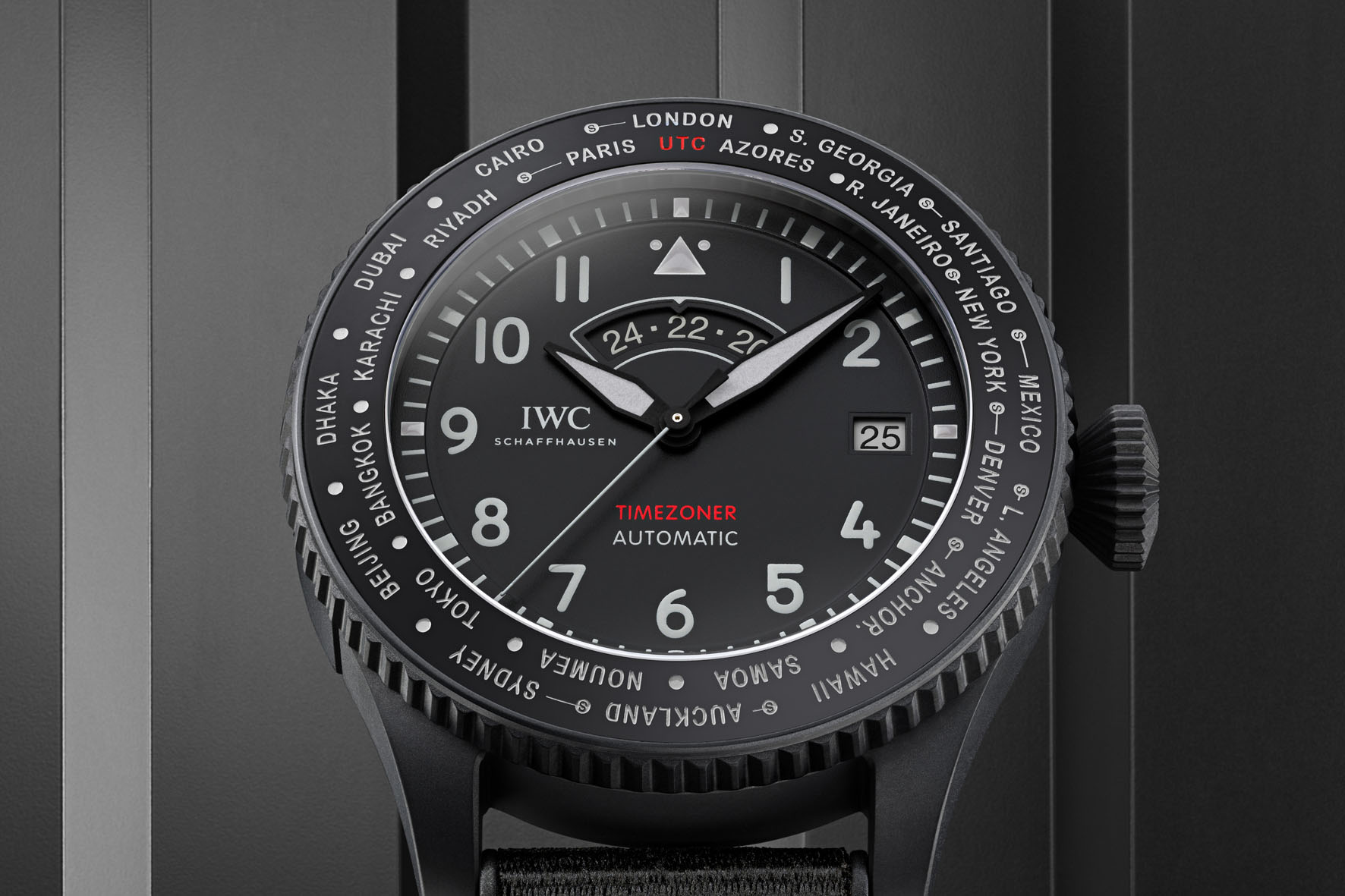 Il Pilot’s Watch Timezoner TOP GUN Ceratanium è il primo modello TOP GUN con complicazione Timezoner. L’orologio può essere impostato su un fuso orario diverso semplicemente premendo e ruotando la lunetta. La lancetta delle ore, l’indicazione 24 ore e la data avanzeranno o retrocederanno a scatti di un’ora. Questo vale anche oltre il passaggio di data e senza perdere un singolo secondo. La cassa da 46 mm è in Ceratanium, mentre l’anello delle città è in ceramica. Contiene i nomi di 24 città, ognuna in rappresentanza di un fuso orario internazionale. I numeri sono stampati in grigio sul quadrante e i numeri 12, 3, 6 e 9 sono rivestiti di materiale luminescente. Il design nero corvino è completato da un fondello in vetro zaffiro fumé e da un cinturino in gomma nera con inserto in tessuto. Il calibro di manifattura IWC 82760 utilizza un sistema di ricarica Pellaton rinforzato con componenti in ceramica per accumulare una riserva di carica di 60 ore nella molla motrice. La produzione annua del Pilot’s Watch Timezoner TOP GUN Ceratanium sarà limitata a 500 esemplari. (Prezzo €. 18.500)