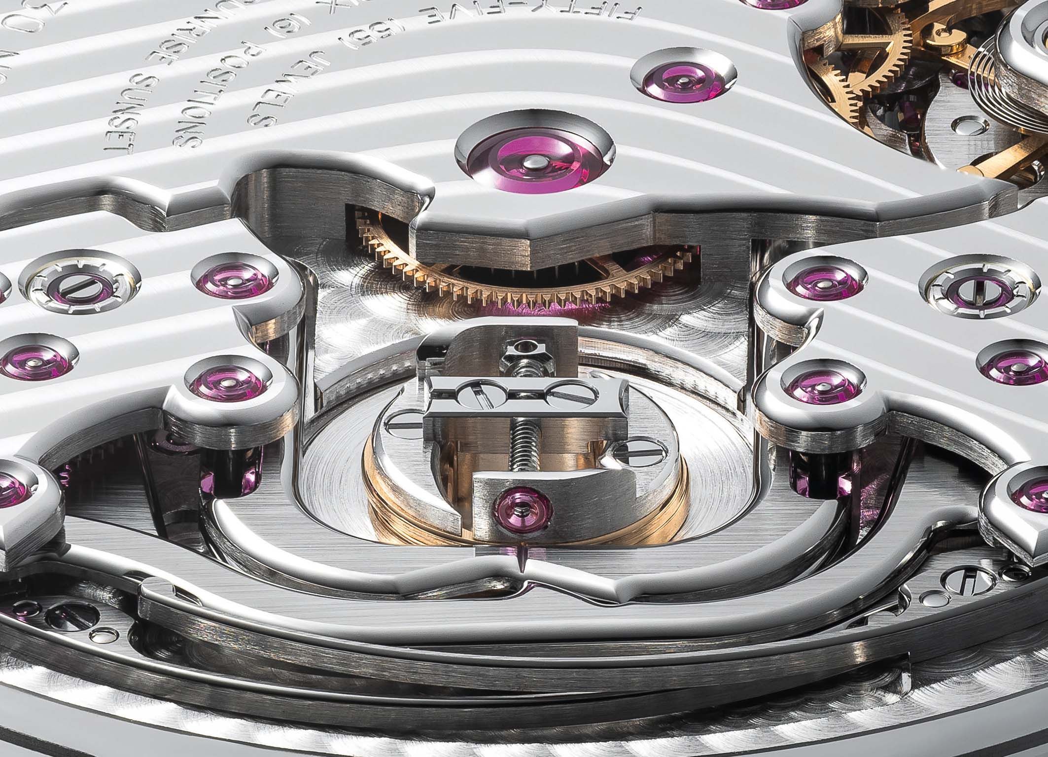 Accanto a questa funzione distintiva, il movimento integra ore e minuti, indicazione su 24 ore, calendario semplice e mese, offrendo una lettura completa del tempo senza mai compromettere la chiarezza. In questa interpretazione, la struttura meccanica rimane invariata ma viene reinterpretata visivamente, dimostrando come la tecnica possa diventare un linguaggio narrativo.
