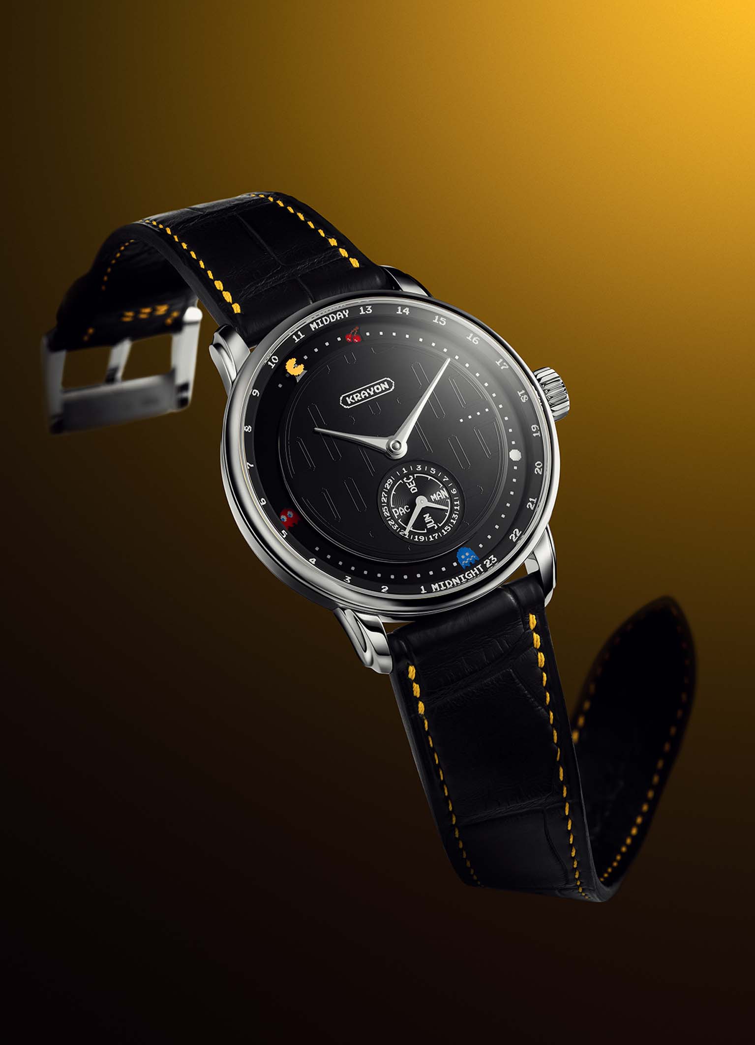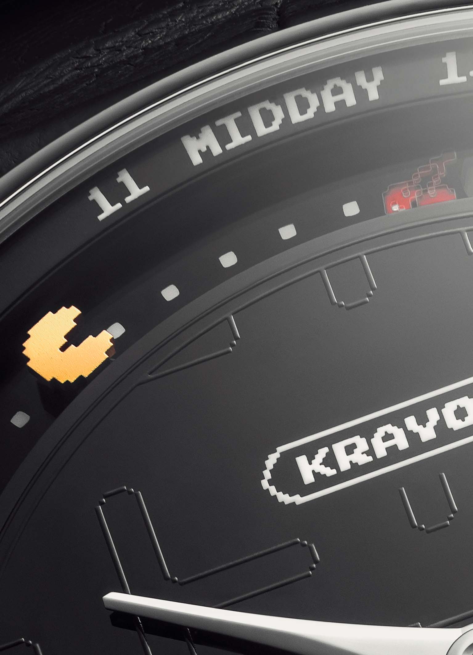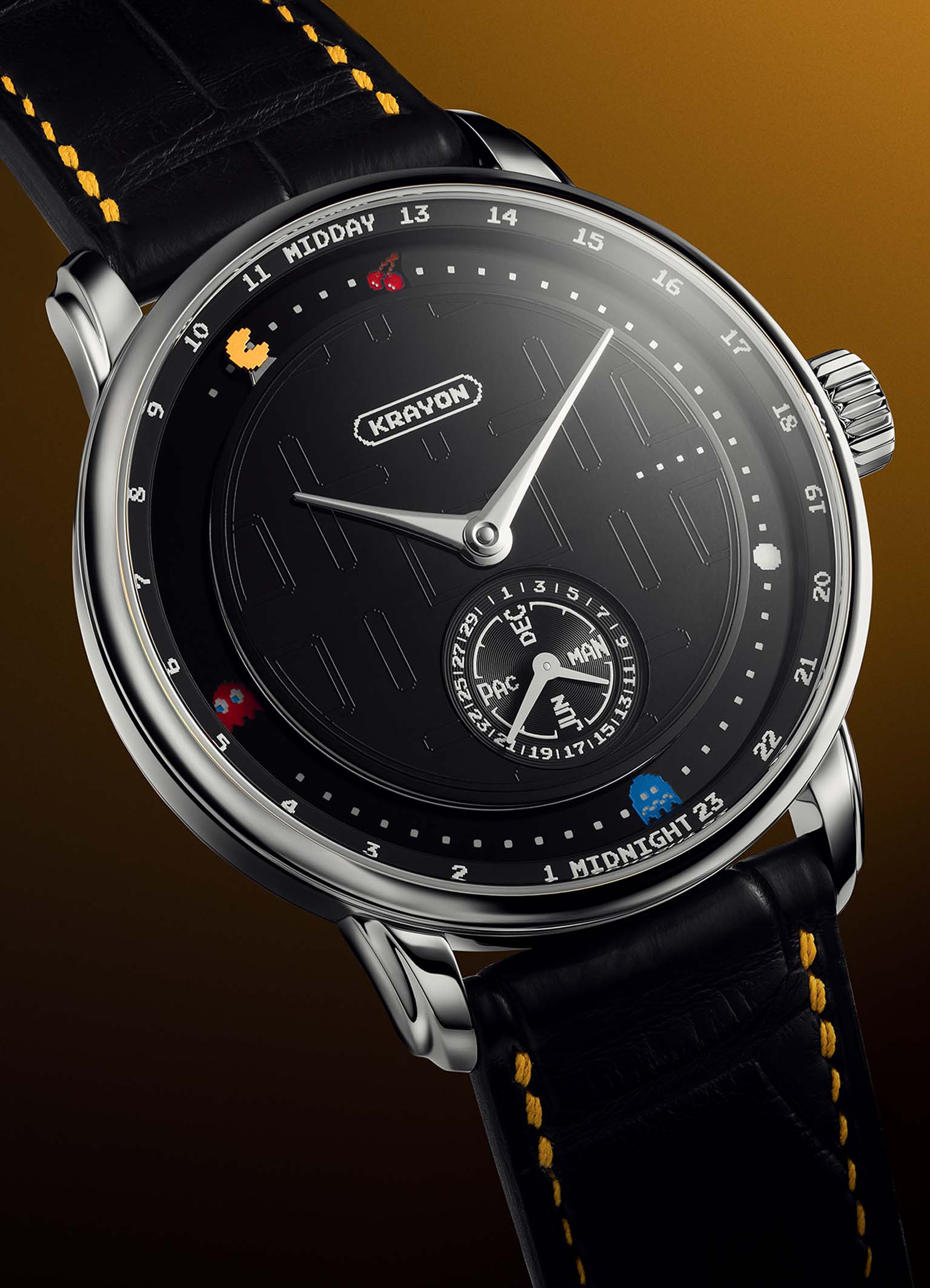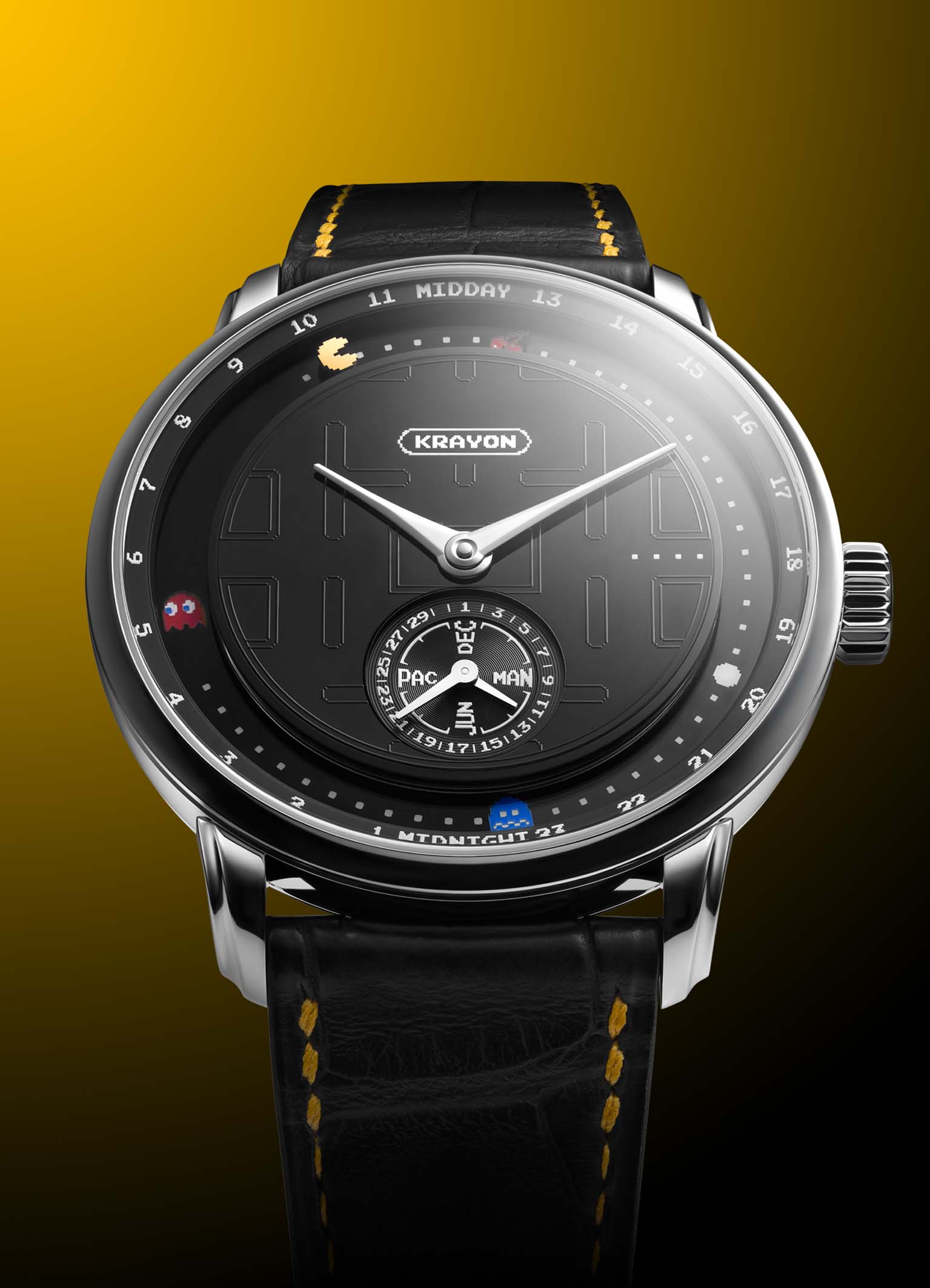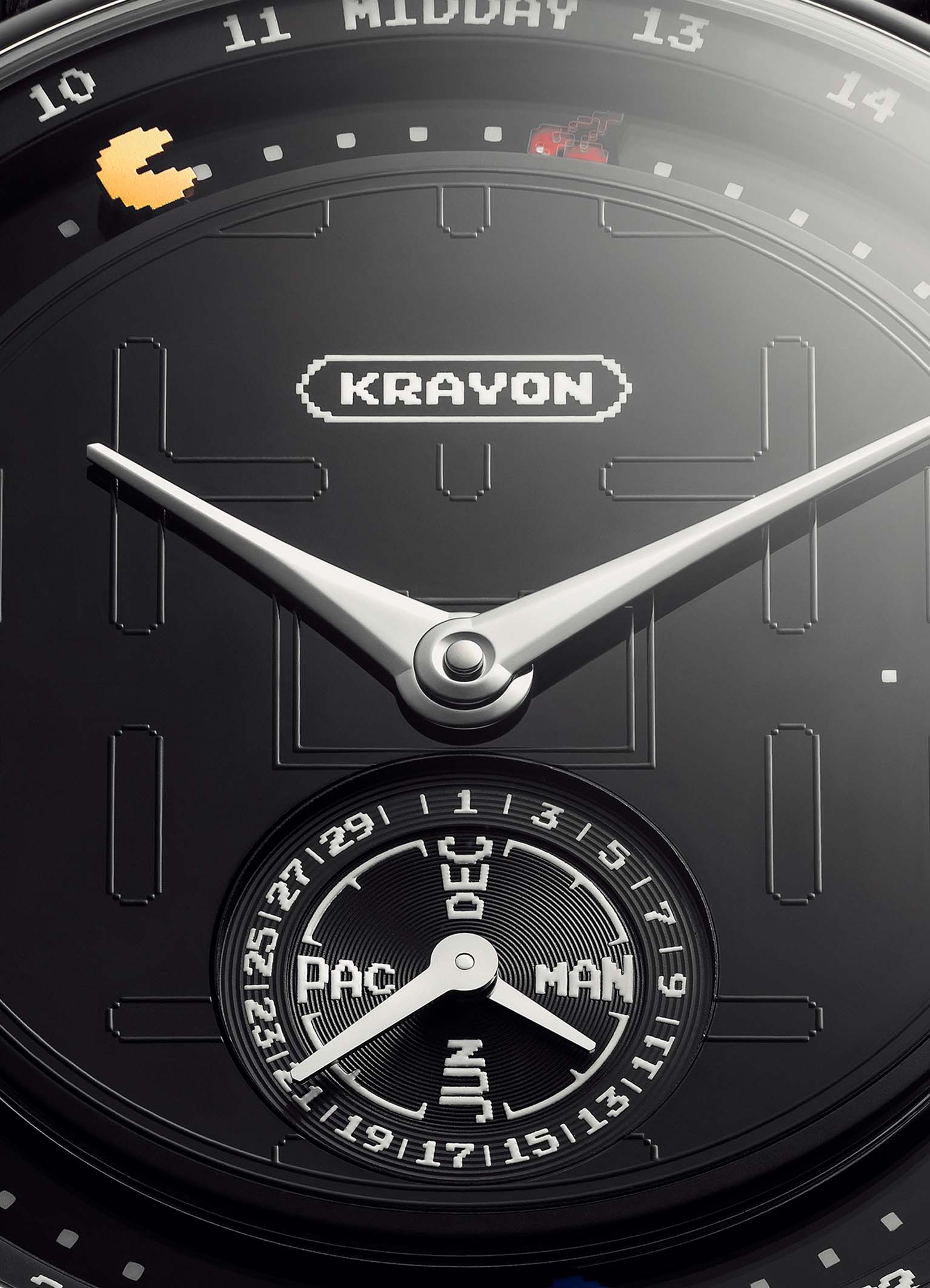 Dal punto di vista estetico, Krayon sceglie un approccio rigoroso, tornando alla versione originale del 1980 senza reinterpretazioni forzate. Il quadrante in onice lucido, profondo e uniforme, accoglie il labirinto iconico reso visibile solo in particolari condizioni di luce, mentre gli elementi, dipinti a mano, mantengono proporzioni fedeli all’originale. Anche la tipografia pixel e il logo reinterpretato rafforzano il legame con l’universo PAC-MAN senza mai risultare invasivi.