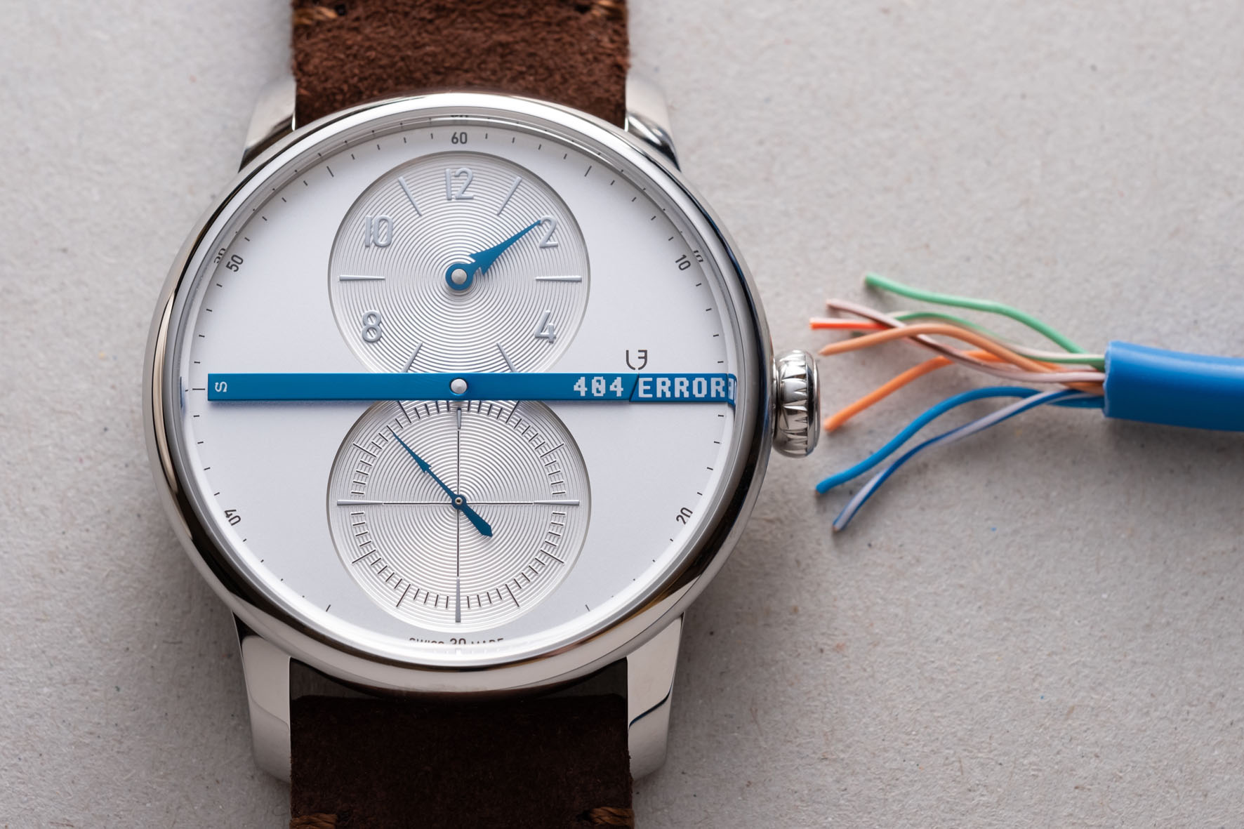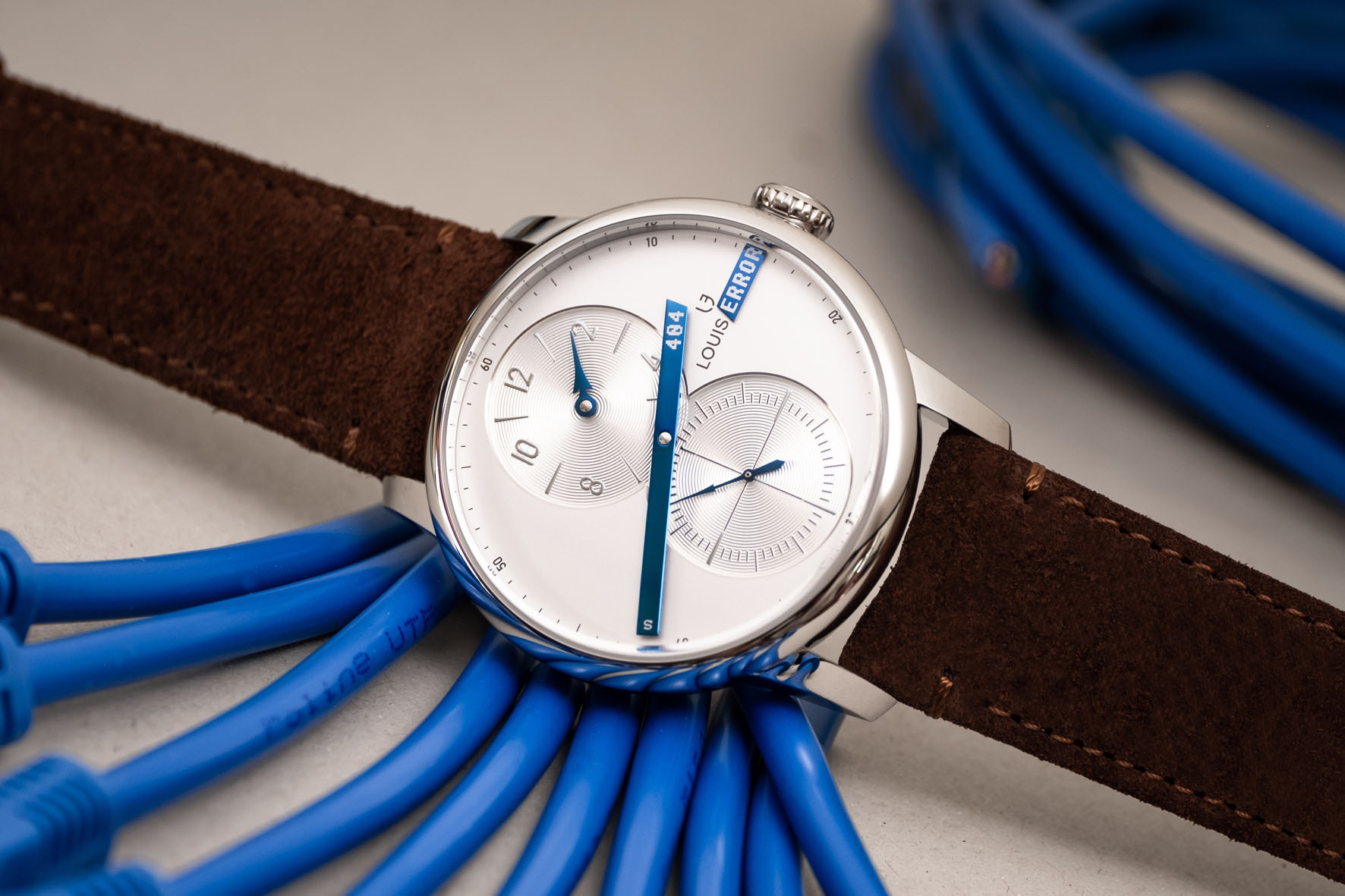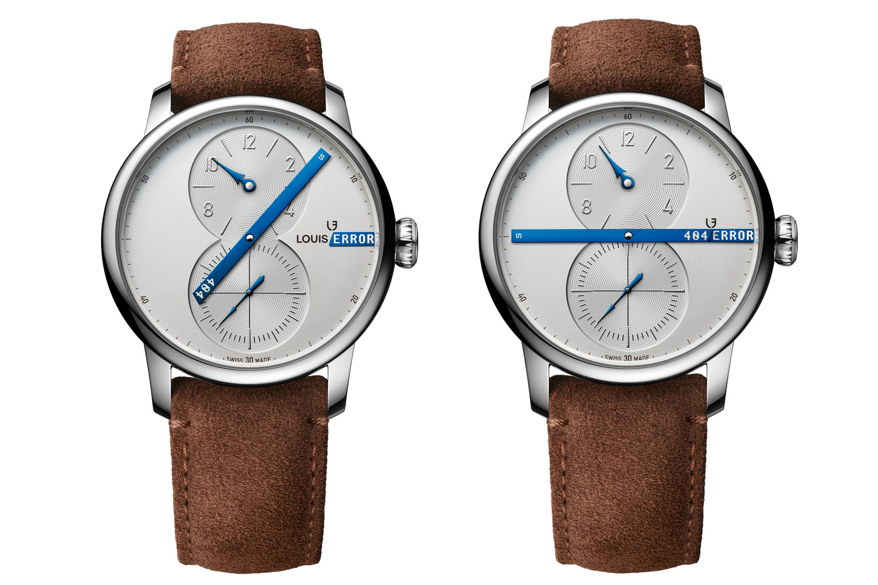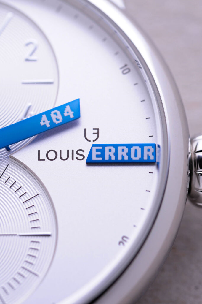 E Louis Erard ha il coraggio di dirlo: gli esseri umani non sarebbero completi senza una buona dose di umorismo e autoironia. Da Louis Erard a Louis Error. Le Régulateur, le régule à tort (regola erroneamente). Quelle erreur est-il? (Che errore è?). Trova l’errore. Errore 404: proprio come l’indirizzamento errato nell’informatica, c’è un errore nell’adattamento: quest’ora non esiste. Errore 404: tranne che questa lancetta torna ad incrociare il quadrante con una linea blu ogni volta che i minuti scoccano i quarti. Un piccolo cambiamento, una grande differenza.