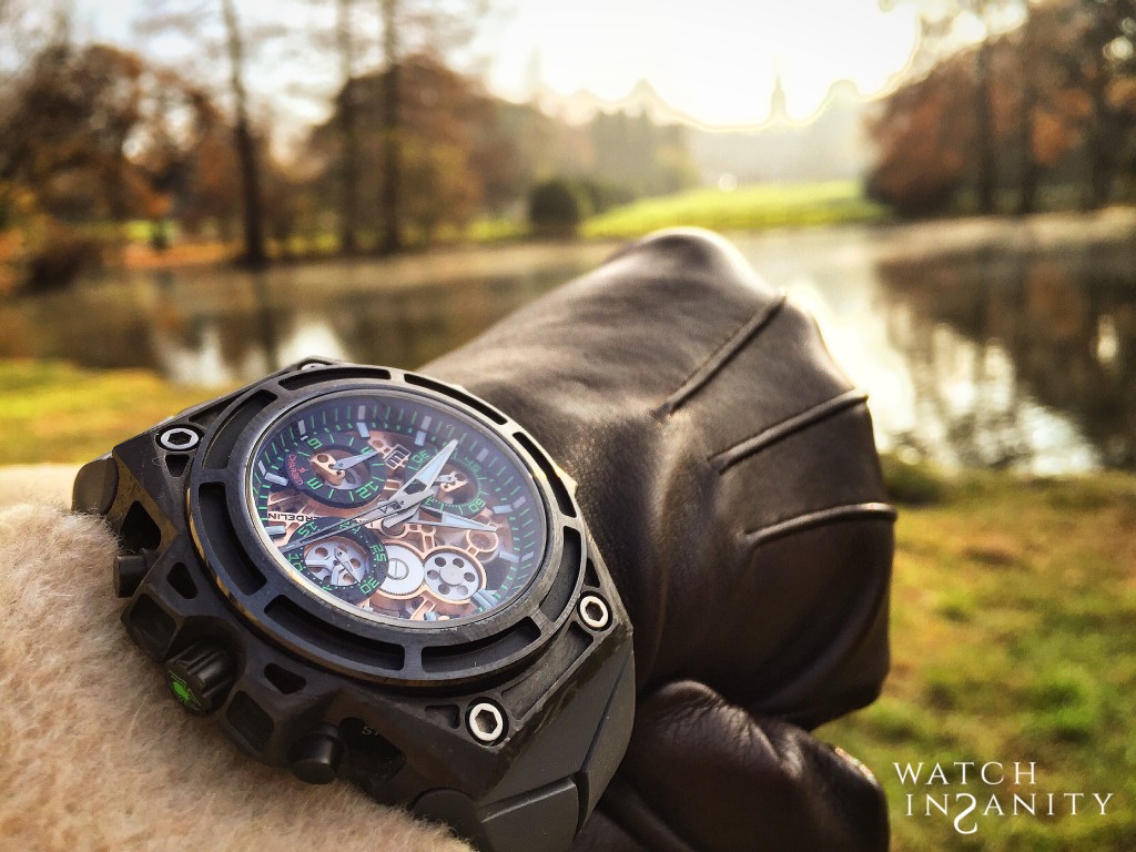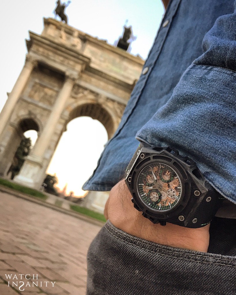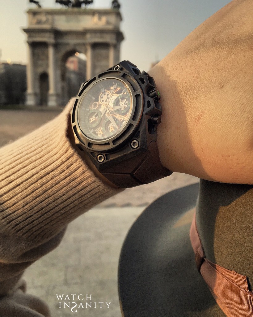 A primo impatto può sembrare grande e complicato, ma in realtà, una volta messo al polso, tutto cambia. La cassa in carbonio lo rende leggero e resistente, mentre il movimento scheletrato gli da un tocco attraente e ricercato.