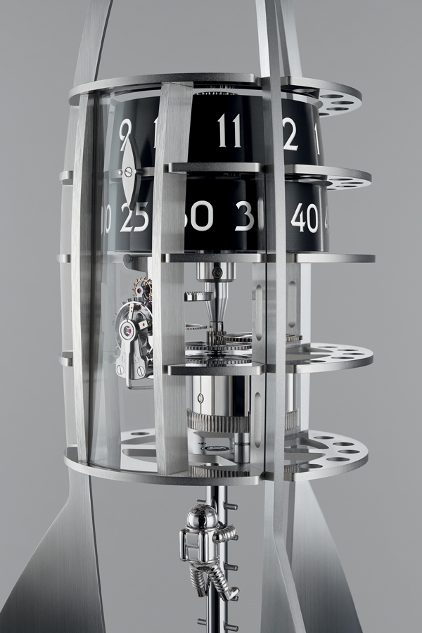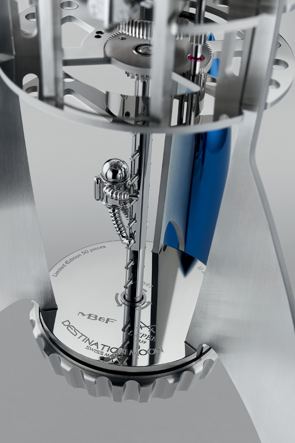 La struttura verticale concentrica del movimento otto giorni è stata sviluppata appositamente per il Destination Moon, tuttavia presenta anche forti analogie con quello della Horological Machine N.7 Aquapod, presentata di recente da MB&F: il primo è un orologio da tavolo ispirato a una navicella spaziale e il secondo un orologio da polso che ricorda una medusa, ma entrambi sono dotati di un movimento dall’architettura verticale concentrica, ed entrambi sono alimentati dalla base.