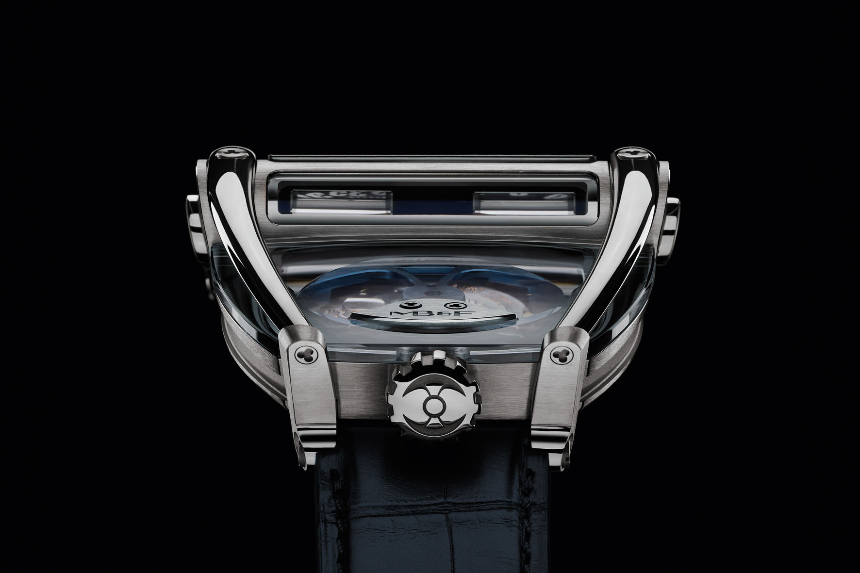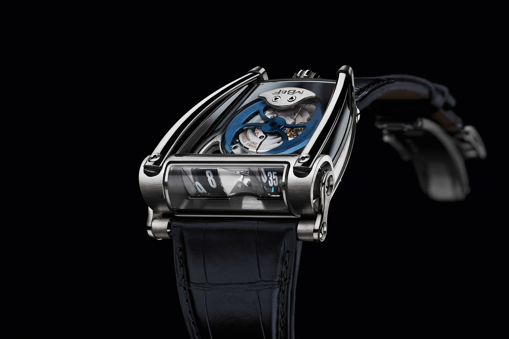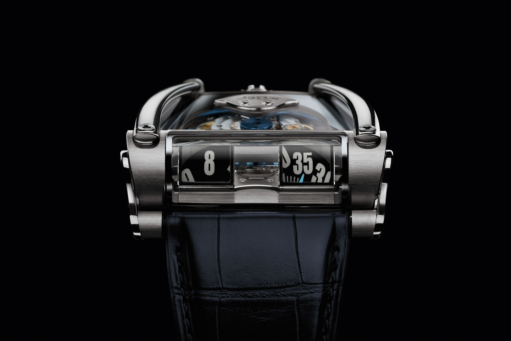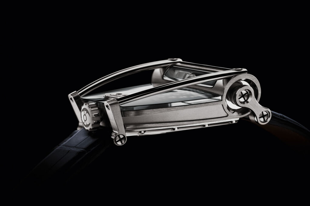 L’ispirazione è arrivata da un pazzo design di Amida, denominato Amida Digitrend, un orologio svelato nel 1976, subito prima che l’azienda dichiarasse bancarotta. Lavorando a un’idea simile, MB&F ha impiegato un prisma in vetro zaffiro per rendere possibile l’indicazione verticale dei minuti scorrevoli e delle ore saltanti, nonostante fossero più piatti che mai sul movimento. L’ora era indicata in una finestrella che somigliava a un vecchio tachimetro sul davanti della cassa, visibile persino durante la guida. A differenza dell’Amida, con i suoi dischi adiacenti, il design dell’HM MB&F presentava dischi impilati uno sopra l’altro, massimizzando le dimensioni dei numeri e, di conseguenza, la leggibilità.