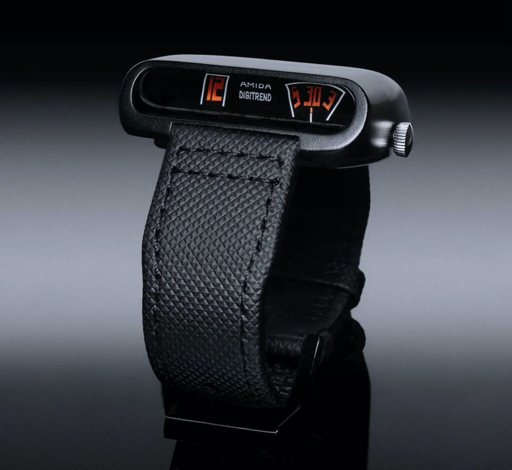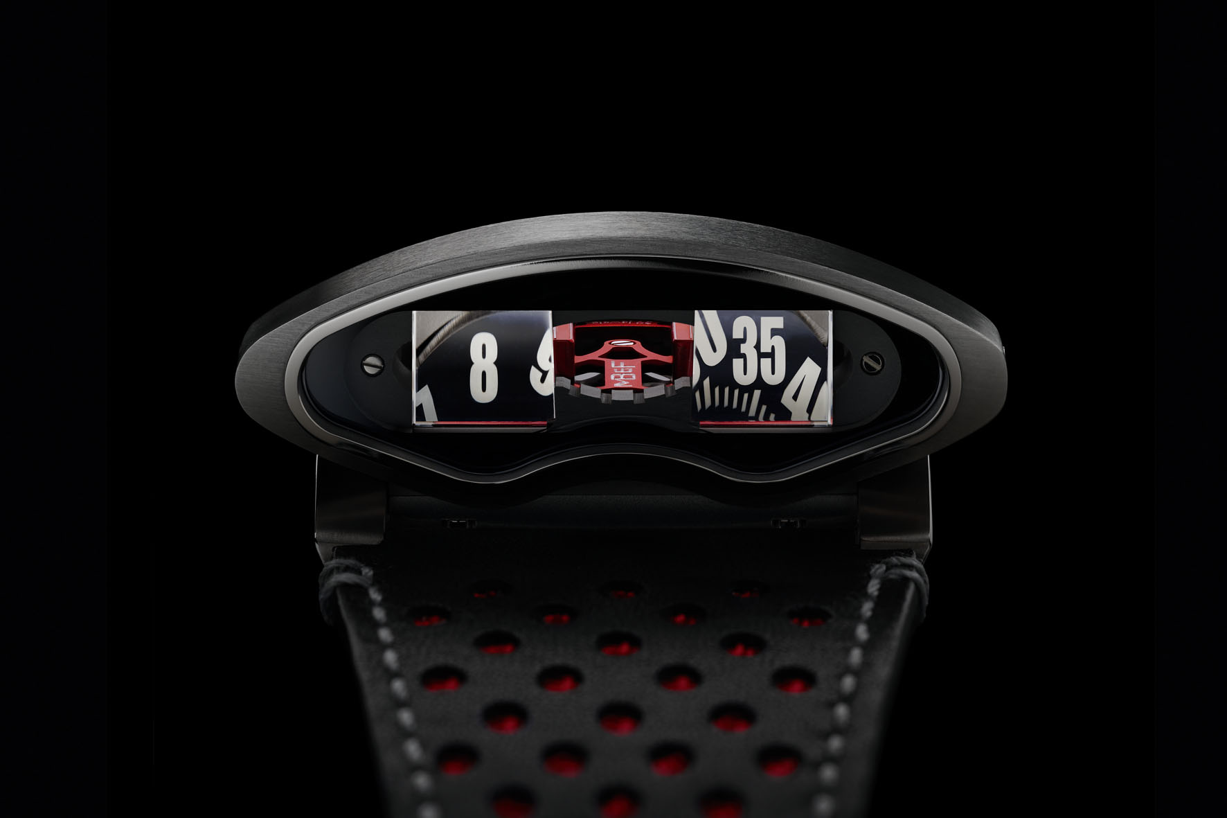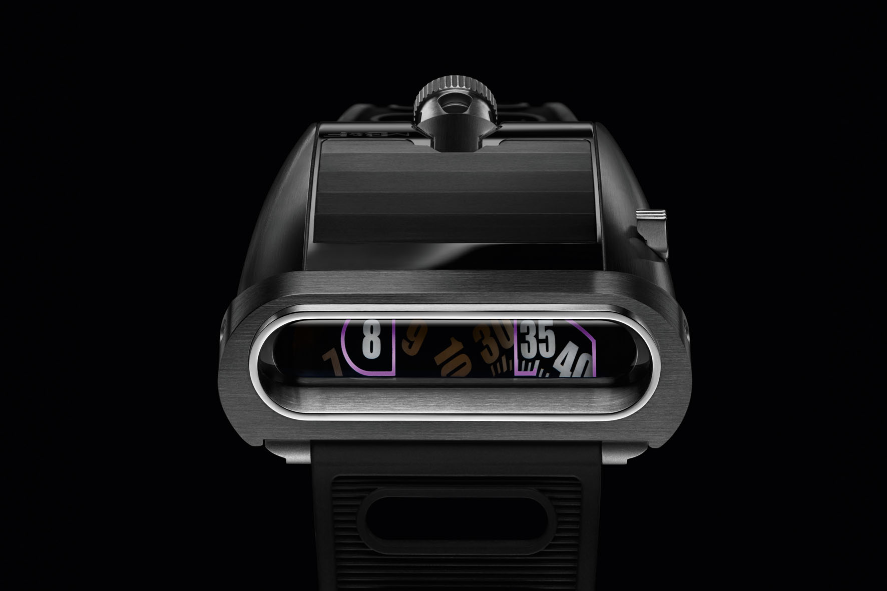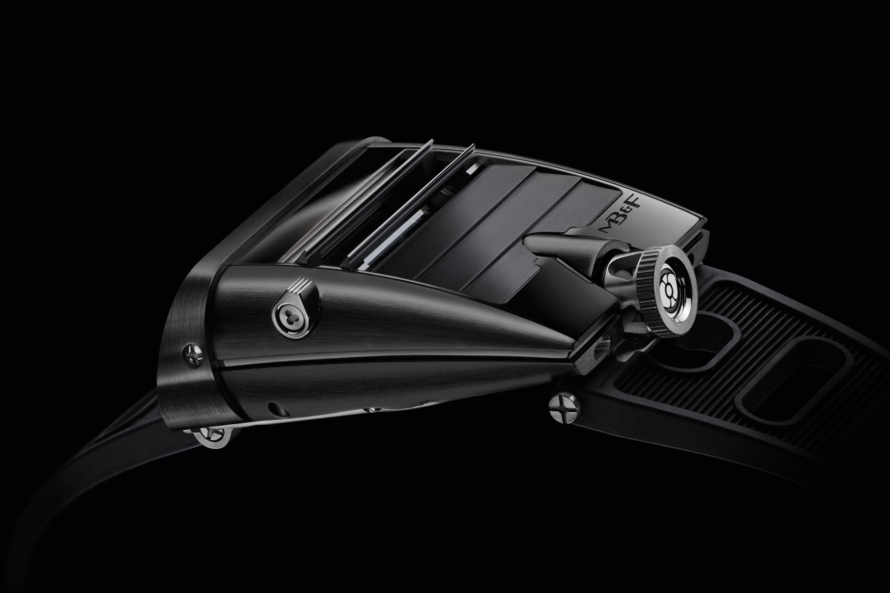 L’ispirazione è arrivata da un pazzo design di Amida, denominato Amida Digitrend, un orologio svelato nel 1976, subito prima che l’azienda dichiarasse bancarotta. Lavorando a un’idea simile, MB&F ha impiegato un prisma in vetro zaffiro per rendere possibile l’indicazione verticale dei minuti scorrevoli e delle ore saltanti, nonostante fossero più piatti che mai sul movimento. L’ora era indicata in una finestrella che somigliava a un vecchio tachimetro sul davanti della cassa, visibile persino durante la guida. A differenza dell’Amida, con i suoi dischi adiacenti, il design dell’HM MB&F presentava dischi impilati uno sopra l’altro, massimizzando le dimensioni dei numeri e, di conseguenza, la leggibilità.