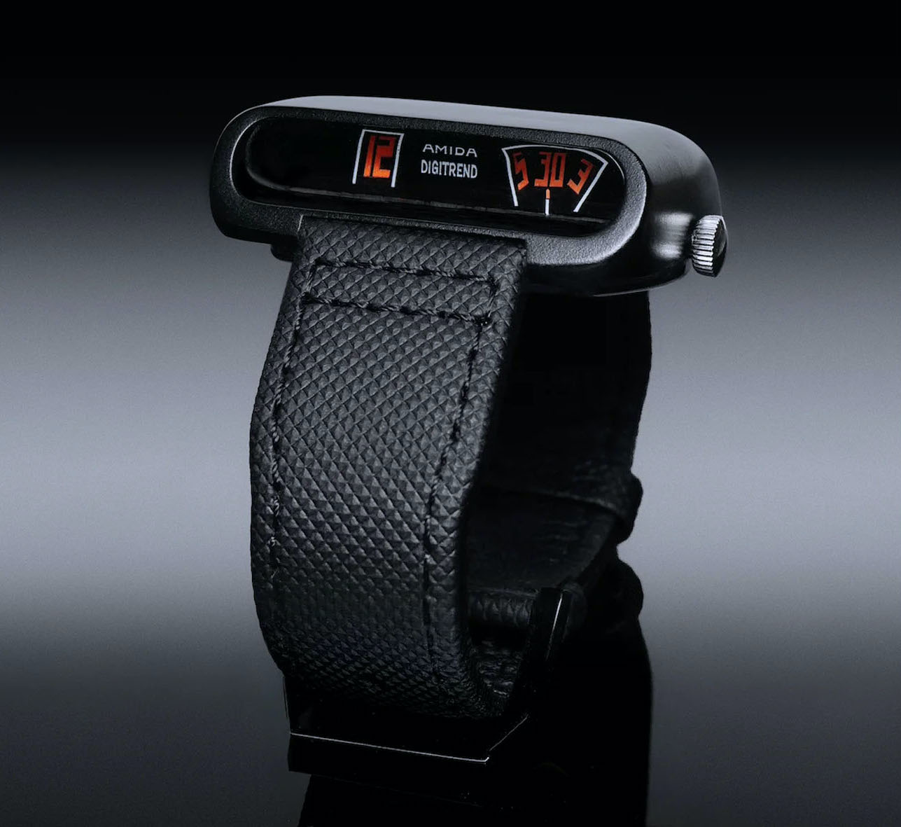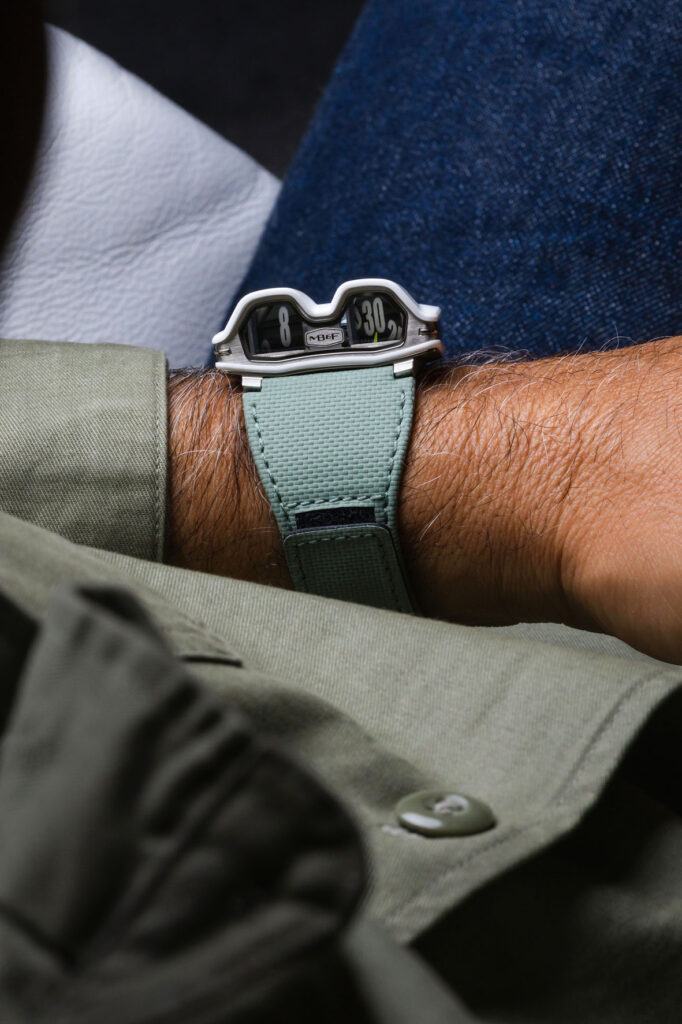 L’ispirazione è arrivata da un pazzo design di Amida, denominato Amida Digitrend, un orologio svelato nel 1976, subito prima che l’azienda dichiarasse bancarotta. Lavorando a un’idea simile, MB&F ha impiegato un prisma in vetro zaffiro per rendere possibile l’indicazione verticale dei minuti scorrevoli e delle ore saltanti, nonostante fossero più piatti che mai sul movimento. L’ora era indicata in una finestrella che somigliava a un vecchio tachimetro sul davanti della cassa, visibile persino durante la guida. A differenza dell’Amida, con i suoi dischi adiacenti, il design dell’HM MB&F presentava dischi impilati uno sopra l’altro, massimizzando le dimensioni dei numeri e, di conseguenza, la leggibilità.