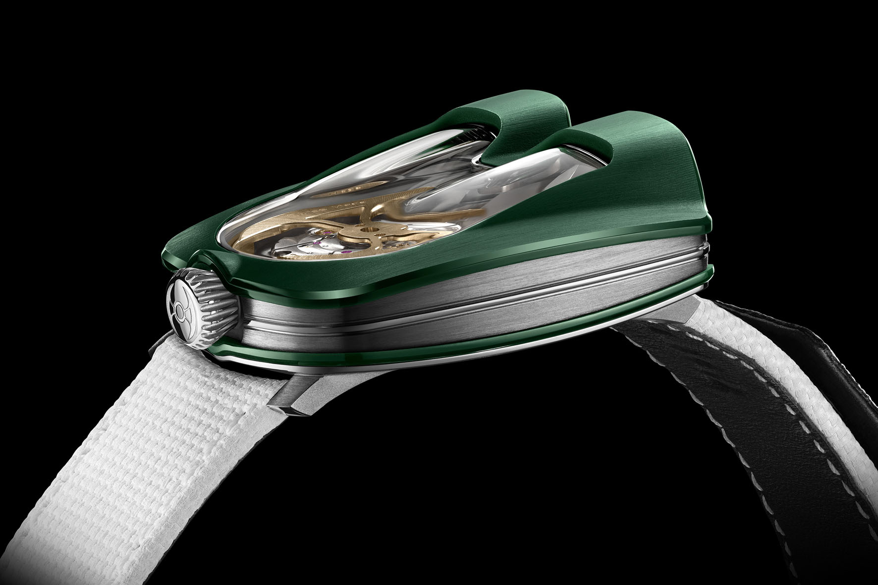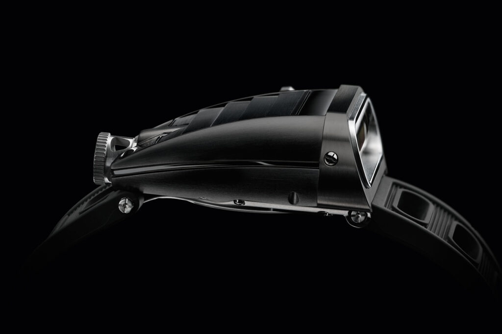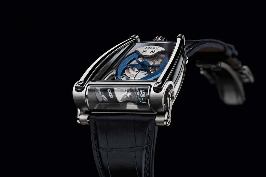 Il legame di MB&F con le automobili ha radici profonde, a partire dal 2012 con l’HM5, a cui hanno poi fatto seguito l’HMX nel 2015 e l’HM8 nel 2016. Tutte queste versioni sono accomunate da una visualizzazione in stile tachimetro sul lato della cassa, un elemento immediatamente riconoscibile che richiama il design audace e futuristico degli anni ’70.