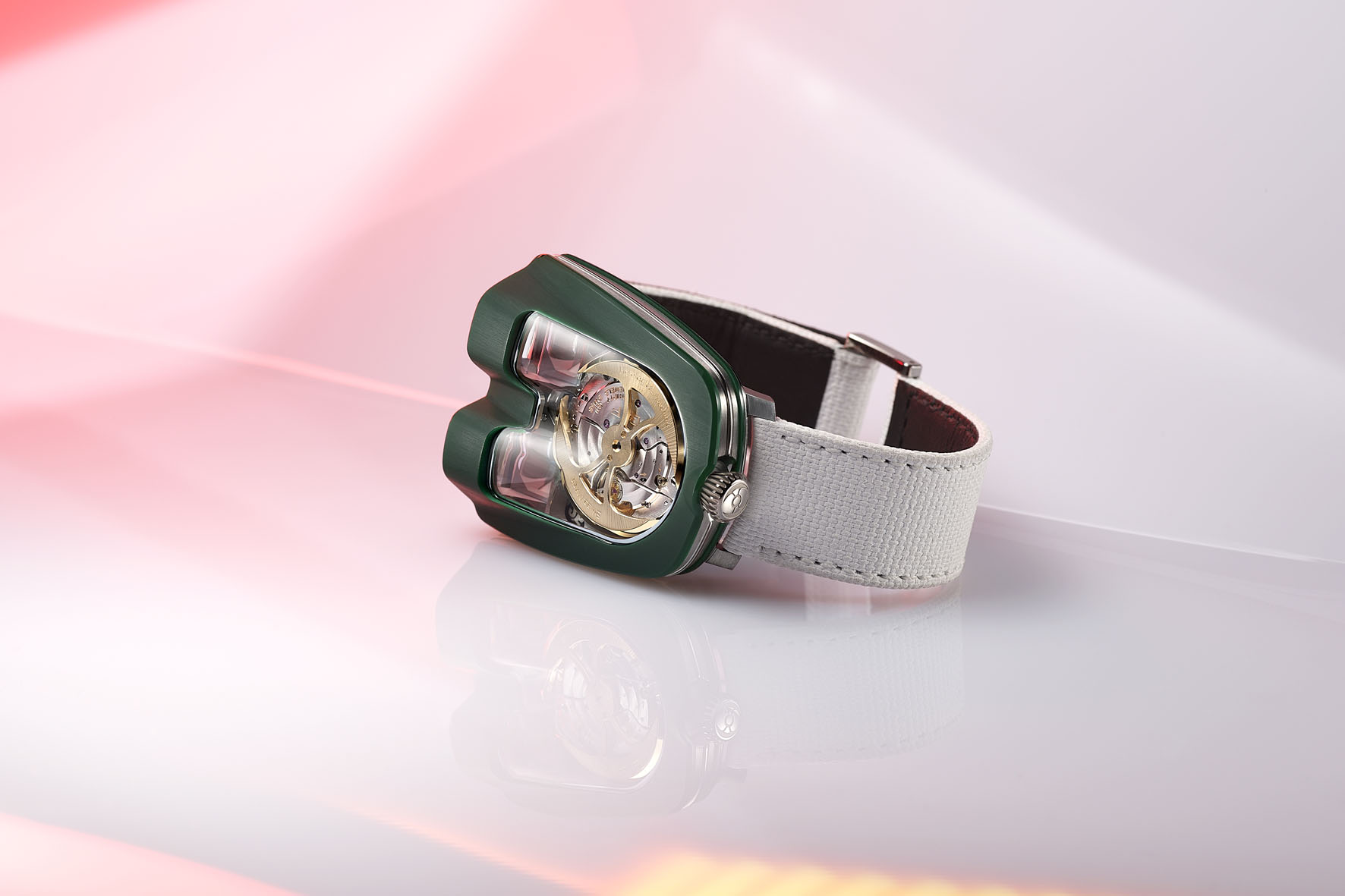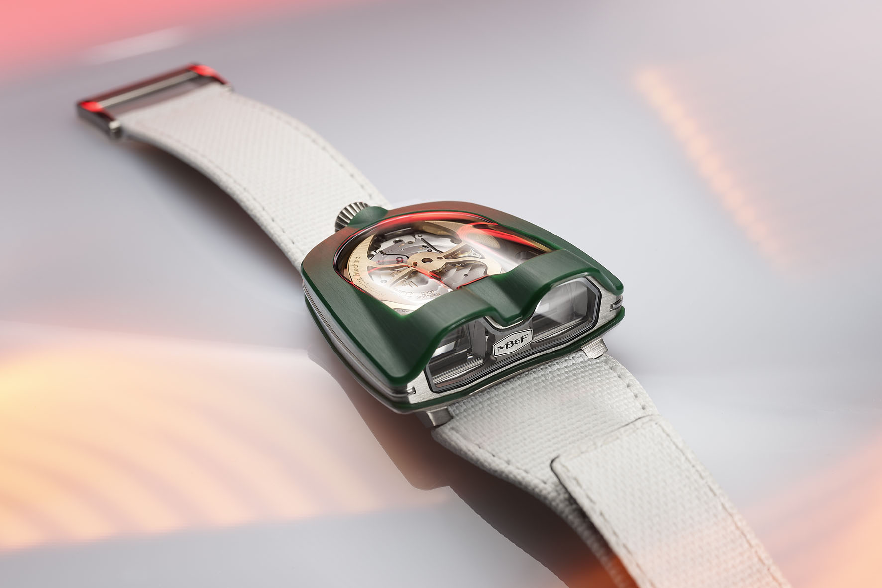 Una lunga serie di orologi MB&F si è spinta oltre i limiti di ciò che è fisicamente possibile in termini di produzione di vetro zaffiro, e l’HM8 Mark 2 non fa eccezione. La creazione di questo vetro zaffiro con doppia curvatura ha raggiunto una complessità da 30 a 40 volte più costosa rispetto a un vetro zaffiro convesso. Solo un fornitore ha accettato la sfida. Durante le tante ore necessarie per produrre ciascun vetro zaffiro, il rischio di rottura è incredibilmente elevato e, se si rompe, è sempre all’ultimo momento, per la disperazione di tutti coloro che partecipano al procedimento. Una volta portato a termine in sicurezza e montato sul segnatempo, tuttavia, è robusto quanto il vetro zaffiro di qualsiasi orologio sportivo.