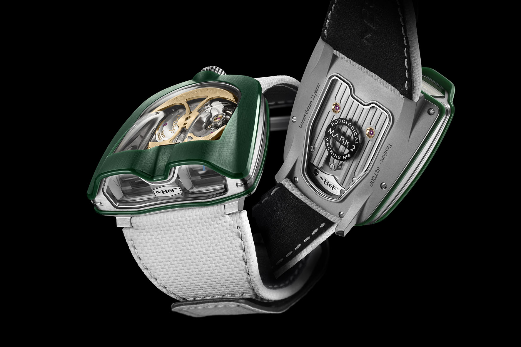 Per la nuova HM8 Mark 2, questa carrozzeria è disponibile in una scelta di CarbonMacrolon bianco o British Racing Green con finitura opaca sul lato superiore e un effetto altamente lucido sui lati. La versione bianca è abbinata a un rotore in CVD verde e indici dei minuti verde chiaro, mentre la versione British Racing Green è dotata di bilanciere e rotore in oro rosso e di indici dei minuti turchesi ed è limitata a 33 esemplari.
