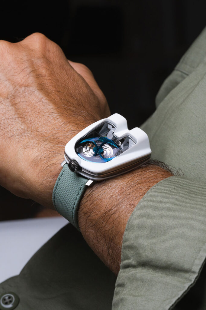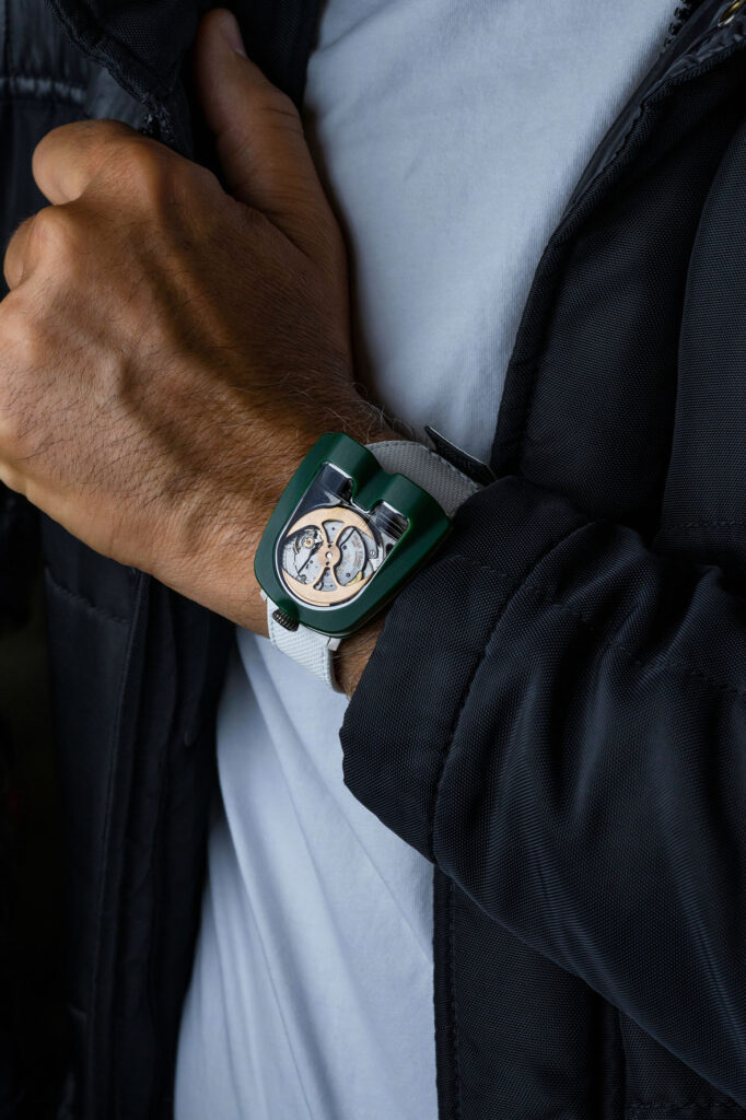 Fu poi la volta dell’HM8 “Can-Am”, con un vetro zaffiro che offriva anche una visuale del rotore in azione. È proprio questo movimento, basato su un calibro Girard-Perregaux, a fungere da base anche per l’inedita HM8 Mark 2. Per il design, l’HM8 si è ispirata alle auto canadesi-americane (da cui il nomignolo “Can-Am”) del famoso campionato Canadian American Challenge Cup. Il design insolito delle auto e i loro roll-bar distintivi hanno ispirato i due roll-bar in titanio dell’orologio.