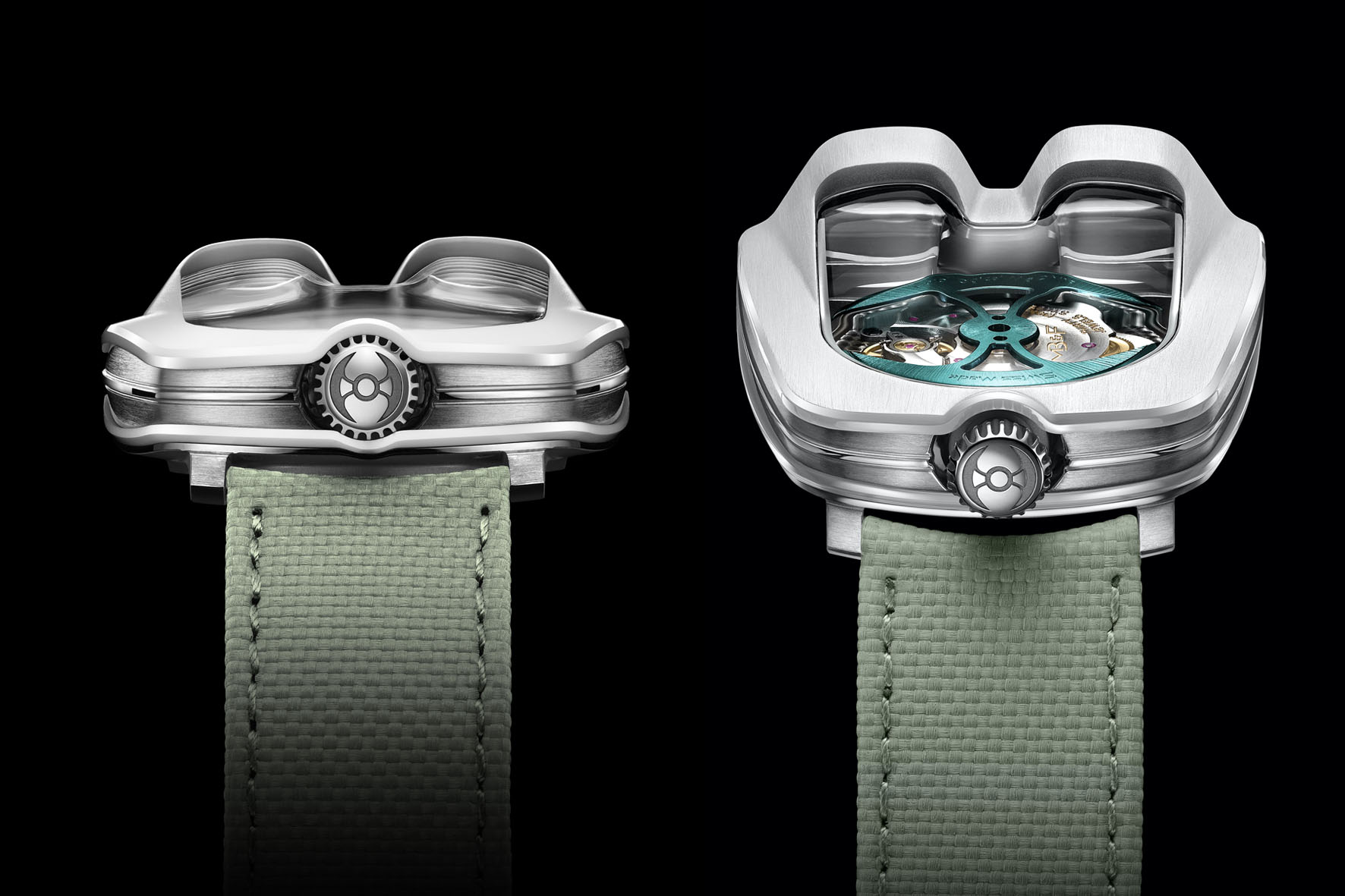 Il mondo dell’automobilismo ha ispirato non solo i codici di design di questi orologi, ma anche la loro costruzione. L’HM5 e l’HM8 Mark 2 sono costruite a partire da un telaio impermeabile indipendente a cui sono stati poi aggiunti i pannelli della carrozzeria dell’orologio, mentre l’HMX e l’HM8 avevano optato per una costruzione monoblocco.