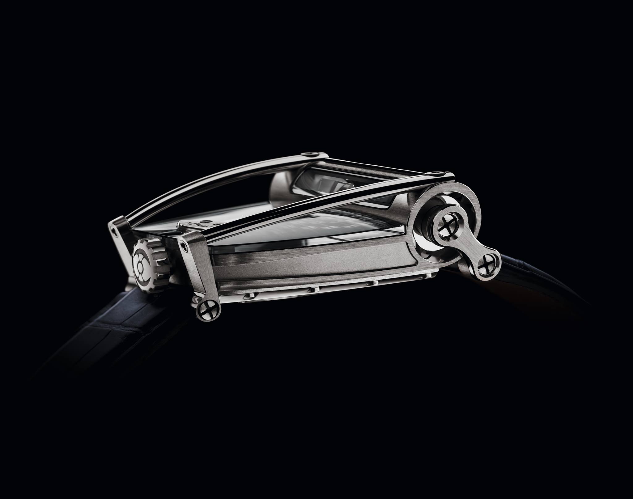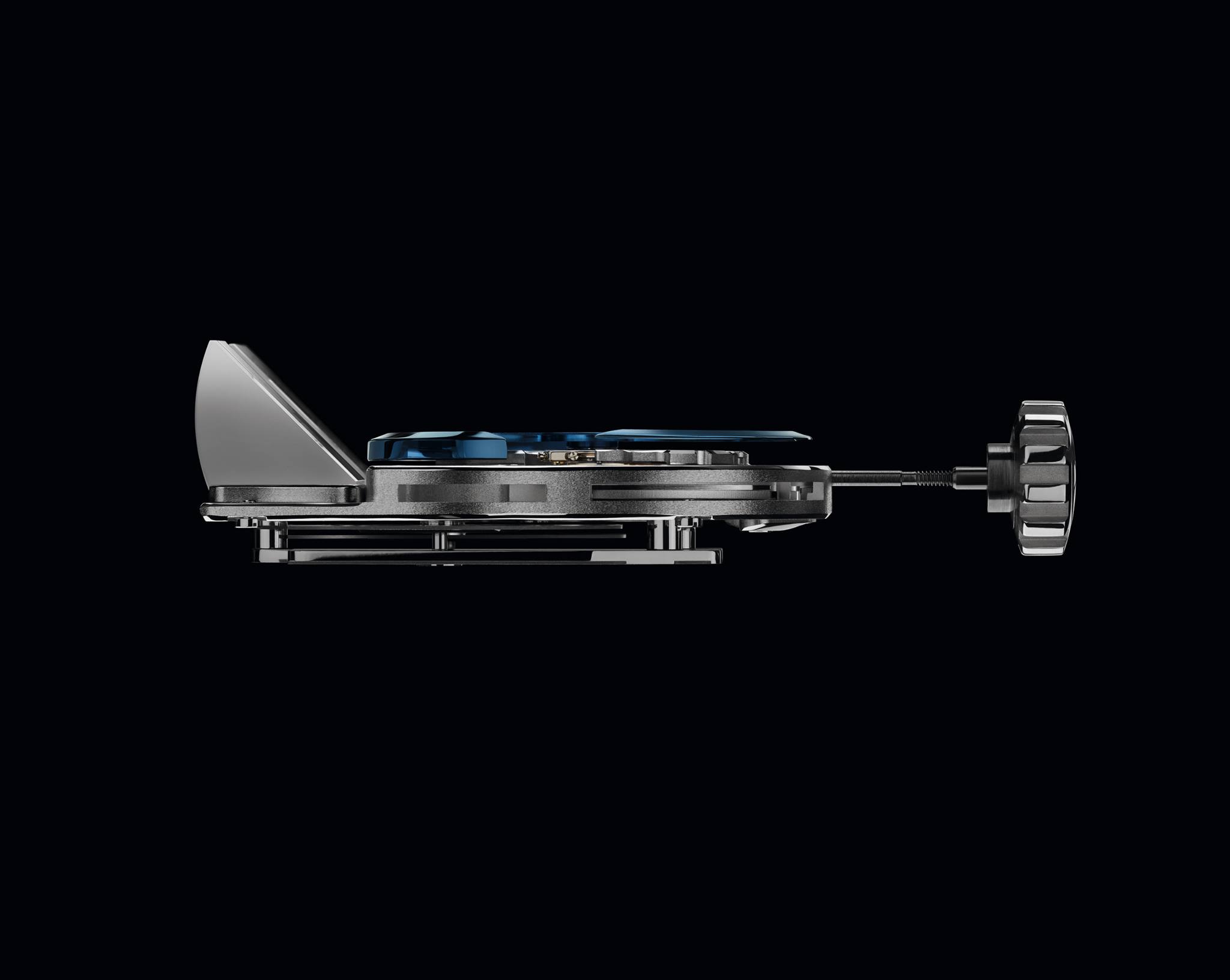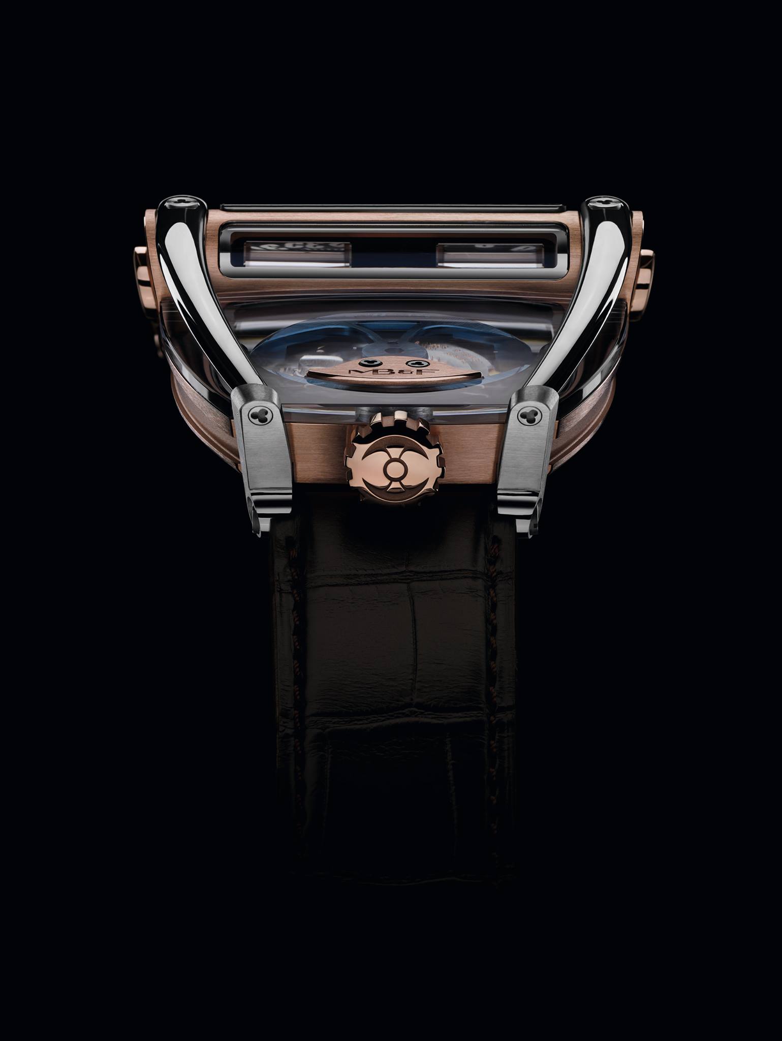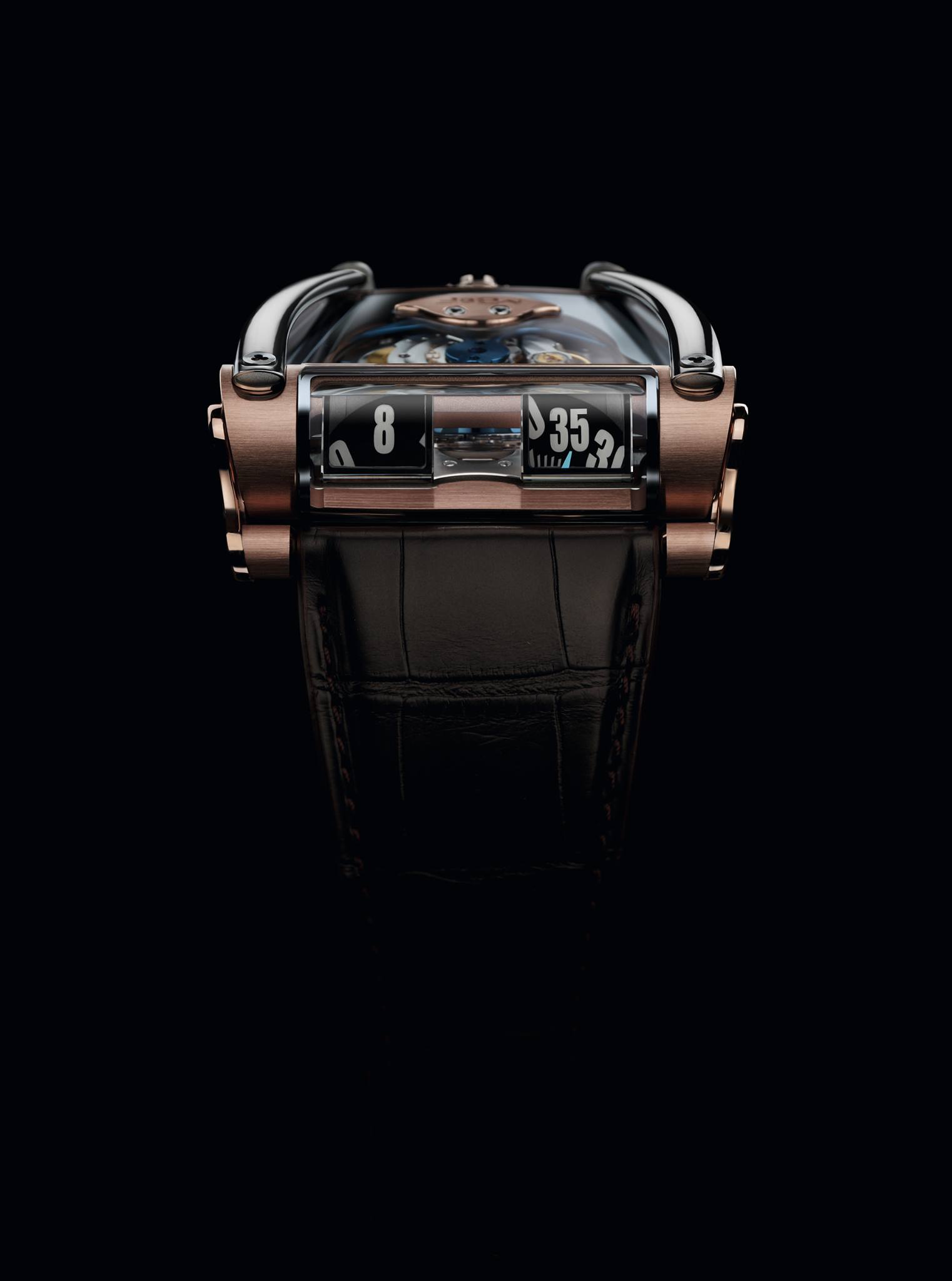 Il meccanismo dell’HM8 è situato in una posizione completamente visibile sotto a una pressoché invisibile copertura del movimento in cristallo zaffiro. Il centro aperto del rotore ad alabarda in oro blu consente di apprezzare la bellissima finitura a onde circolari del movimento, mentre i dischi di indicazione delle ore e dei minuti sono visibili dagli angoli.
