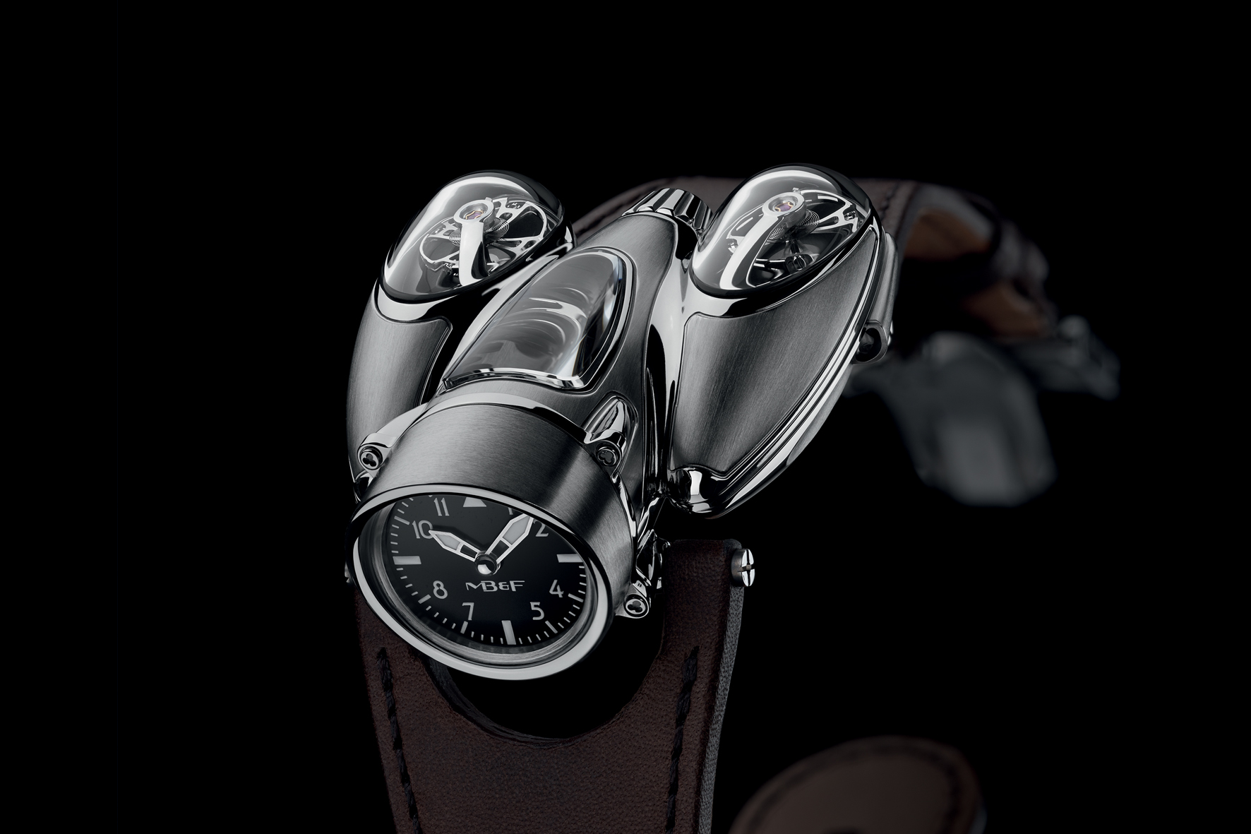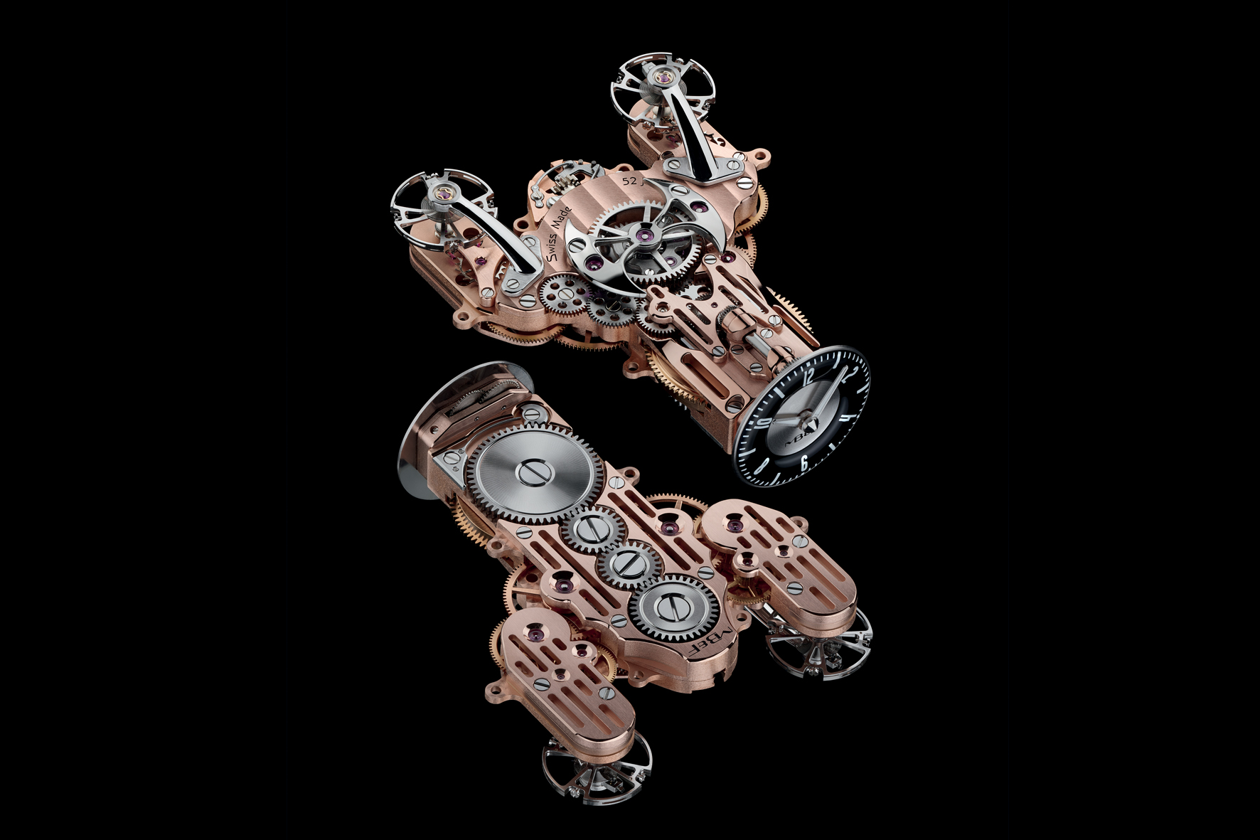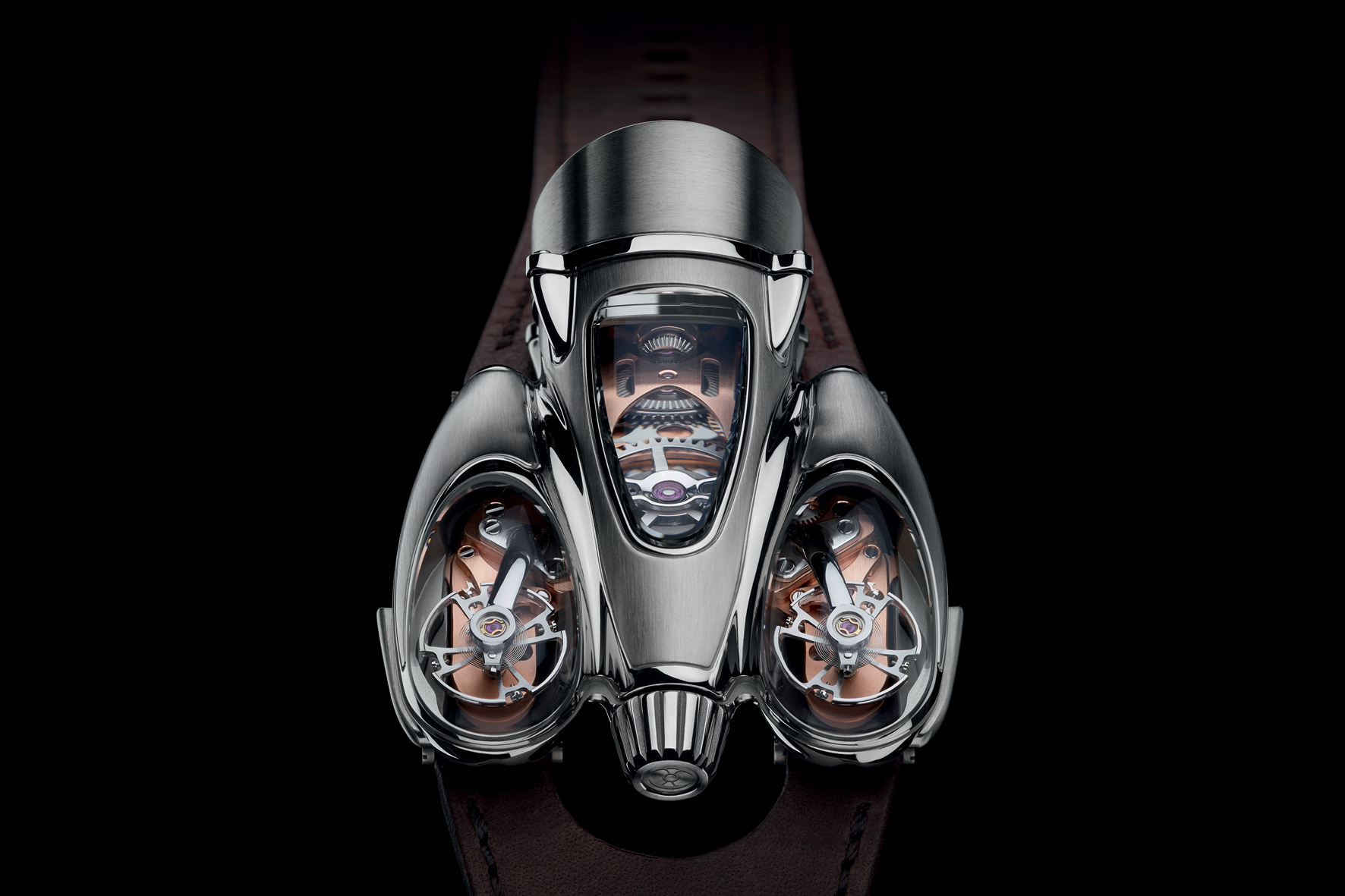 Ricordando un motore a getto, la cassa in titanio altamente complessa, con finiture che si alternano tra il lucido e il satinato, racchiude un movimento a carica manuale altrettanto complesso, sviluppato interamente in-house. Due bilancieri indipendenti battono alla frequenza di 2,5 Hz (18.000 vph) su ciascun lato della Horological Machine N°9, visibili sotto cupole ovali di vetro zaffiro. Un terzo vetro zaffiro sulla parte centrale rivela gli ingranaggi del movimento HM9: un differenziale planetario che calcola la media della potenza erogata dai due bilancieri per fornire una lettura stabile dell’ora.