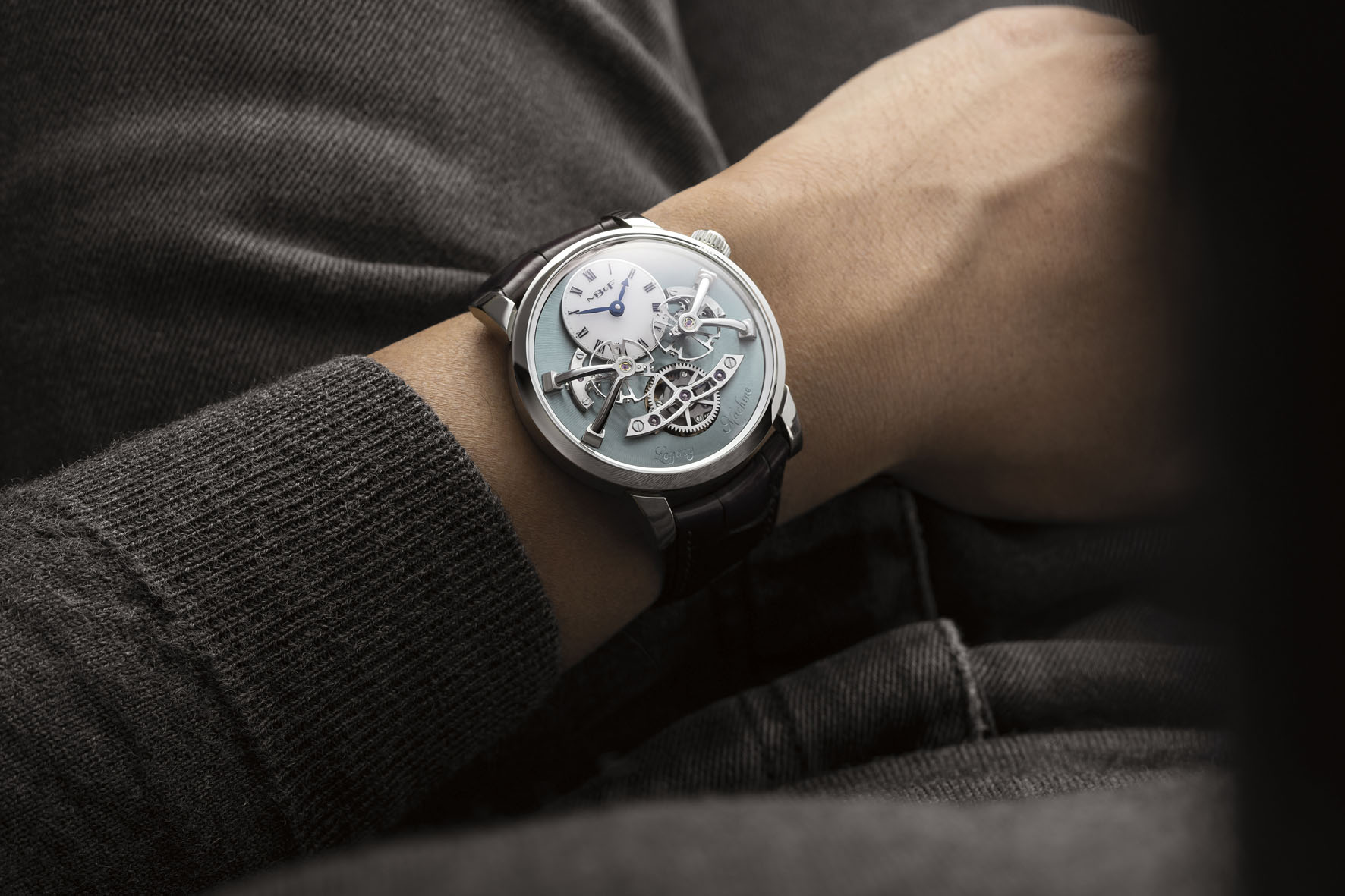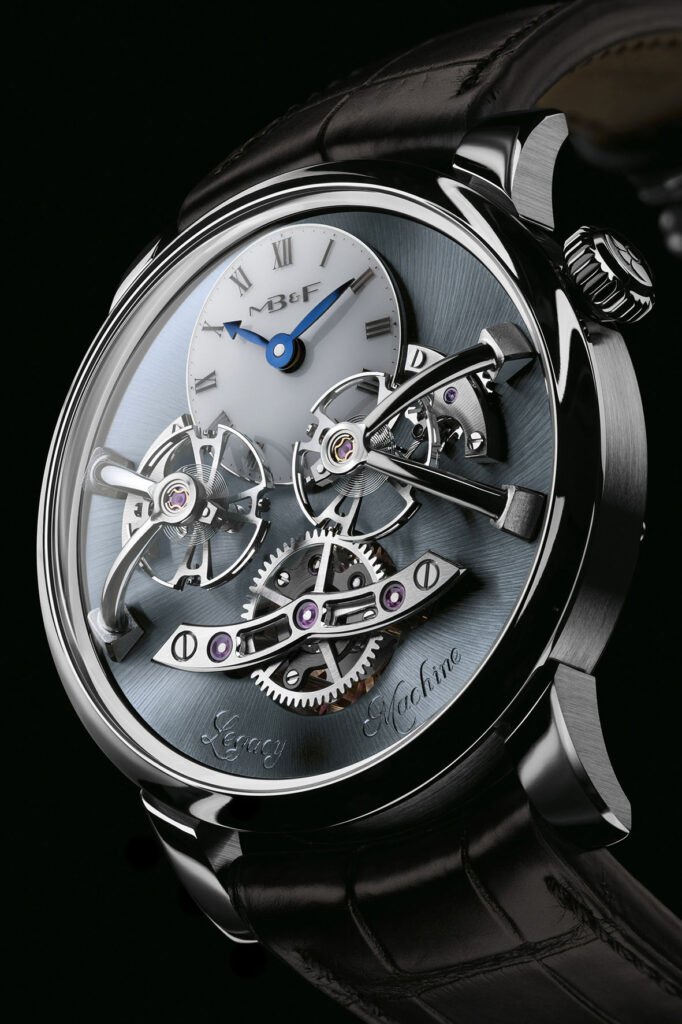 Il quadrante della Legacy Machine N° 2, visibile al di sotto di un vetro zaffiro estremamente bombato, è l’espressione di un movimento incredibilmente rifinito e rappresenta un esempio sorprendente di semplicità e simmetria. Dall’alto verso il basso, troviamo il quadrante secondario laccato bianco a ore 12, con le lancette blu delle ore e dei minuti, perfettamente bilanciato dall’ampio differenziale situato a ore 6. Da sinistra a destra si trovano i due bilancieri sospesi con le rispettive ruote di scappamento che sono lo specchio dei due bariletti nascosti sotto il quadrante.