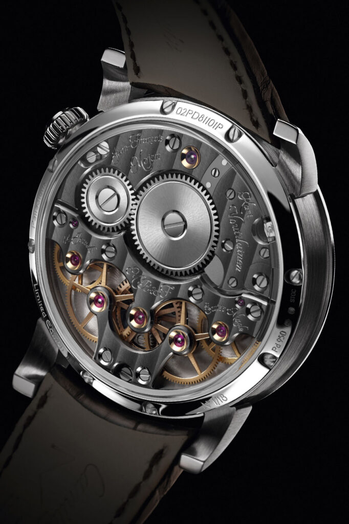 Côtes de Genève immacolate, boccole d’oro, angoli lucidati a specchio e ponti progettati con angoli interni smussati (che non possono essere rifiniti a macchina) illustrano la straordinaria finitura del movimento. Inoltre, la nuova edizione Palladium presenta un’inedita finitura NAC dal profondo colore antracite che conferisce ancora più carattere all’orologio. In linea con lo spirito di trasparenza di MB&F, i nomi dei due creatori del movimento sono incisi a mano sul fondello.