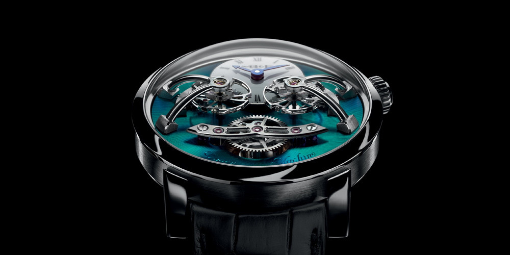 Il quadrante del Legacy Machine No. 2, visibile al di sotto di un vetro zaffiro estremamente bombato, è l’espressione di un movimento incredibilmente rifinito e rappresenta un esempio sorprendente di semplicità e simmetria. Dall’alto verso il basso, troviamo il quadrante a ore 12 laccato con le lancette in oro azzurrate che viene perfettamente bilanciato dal grande differenziale a ore 6. A sinistra a destra si trovano i due bilancieri sospesi con le rispettive ruote di scappamento che sono lo specchio dei due bariletti nascosti sotto il quadrante