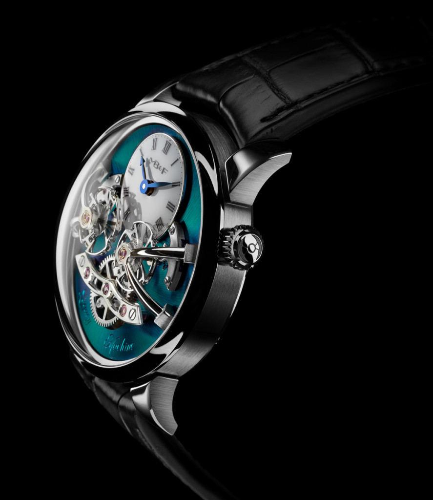 Côtes de Geneve immacolate, boccole in oro, angoli lucidati a specchio e ponti disegnati con angoli acuti (impossibili da riprodurre a macchina) mostrano l’impareggiabile bellezza delle finiture del movimento. In linea con lo spirito di MB&F, i nomi dei due uomini che hanno creato il movimento sono incisi sul retro.