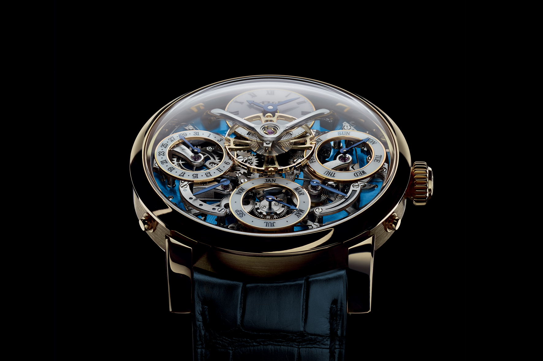 Facendo un giro del quadrante in senso orario, a ore 12 vediamo l’ora e i minuti incastonati tra gli archi del bilanciere; il giorno della settimana a ore 3, l’indicatore della riserva di carica a ore 4, il mese alle 6, l’indicatore dell’anno bisestile retrogrado alle 7, e la data a ore 9. (Prezzo € 147.000 + IVA)