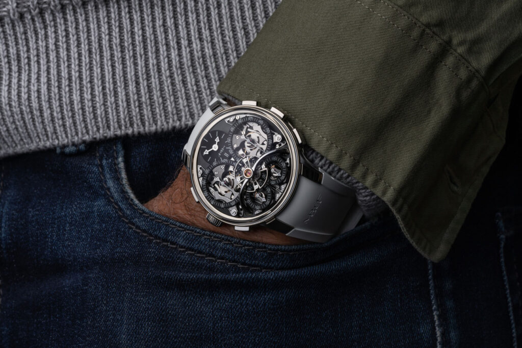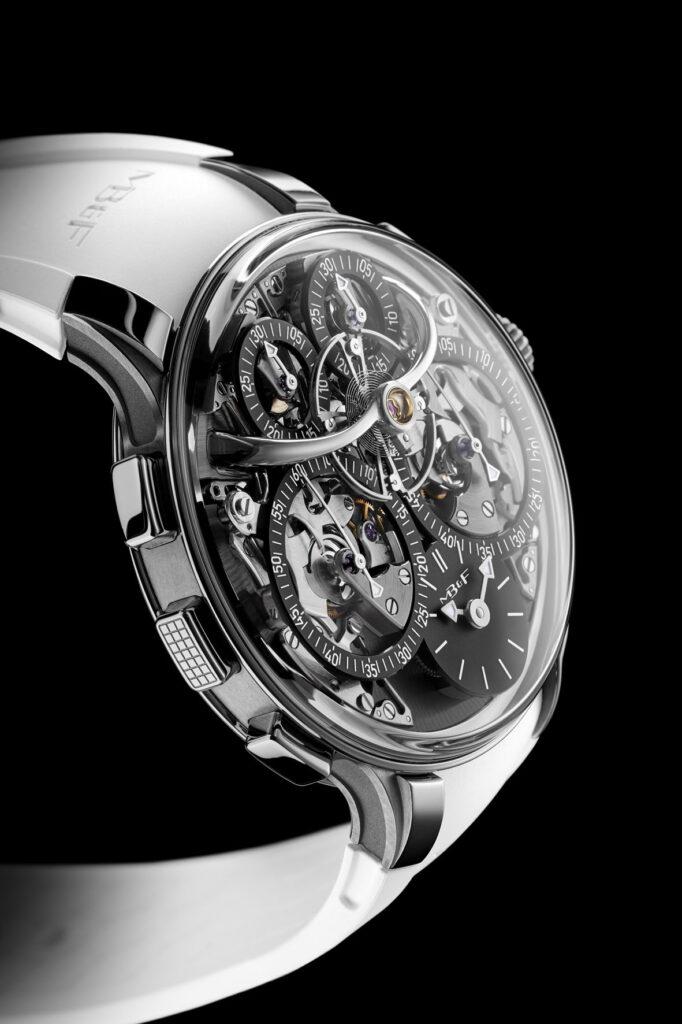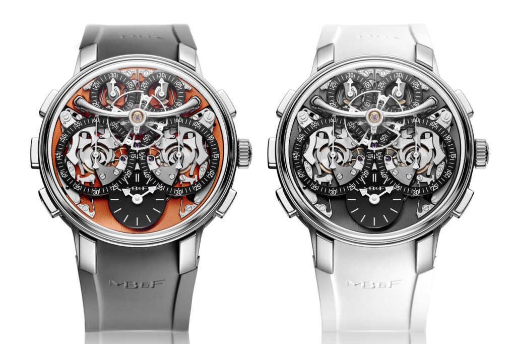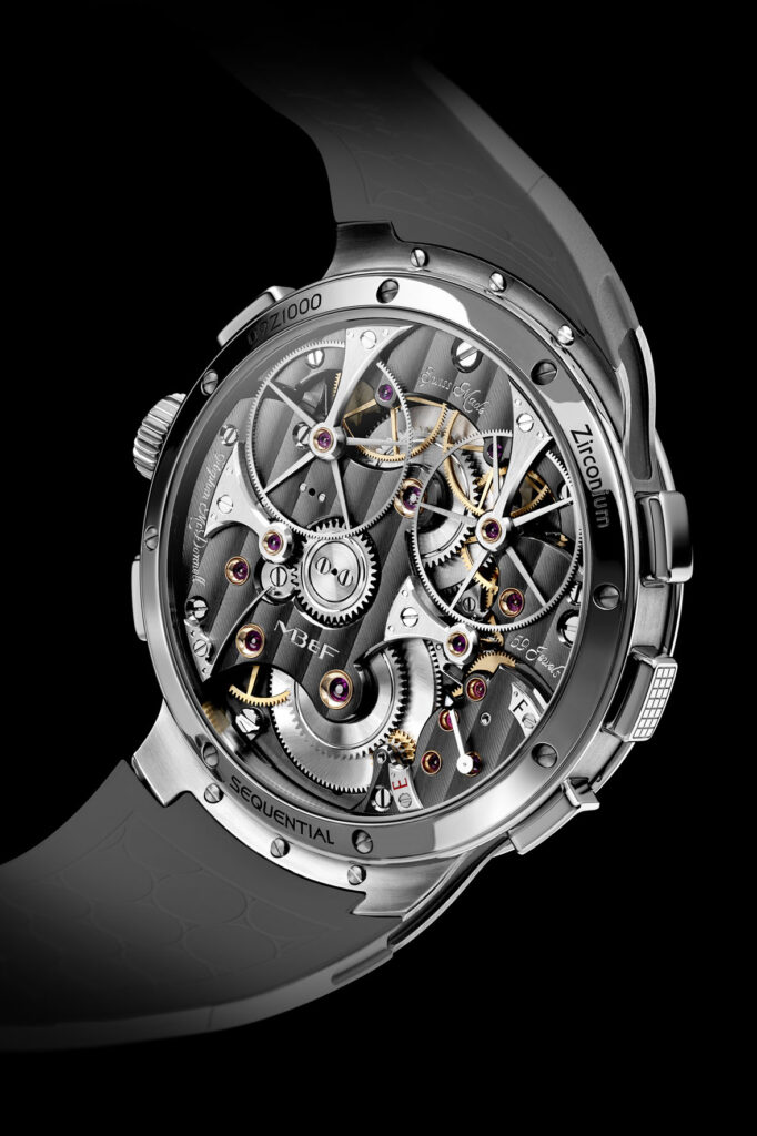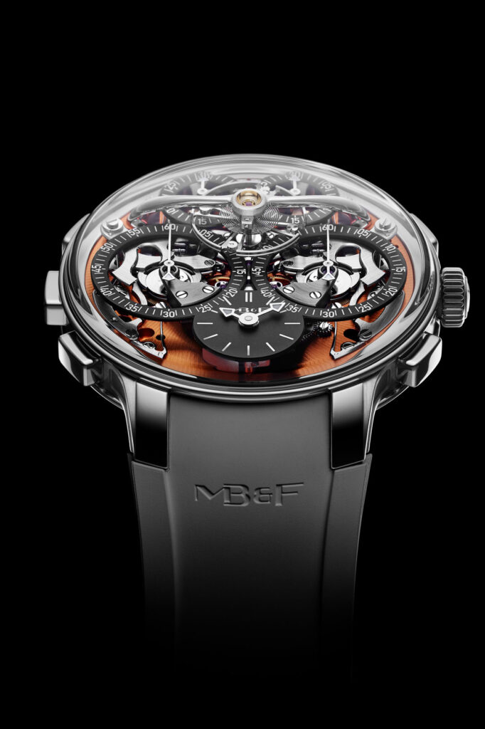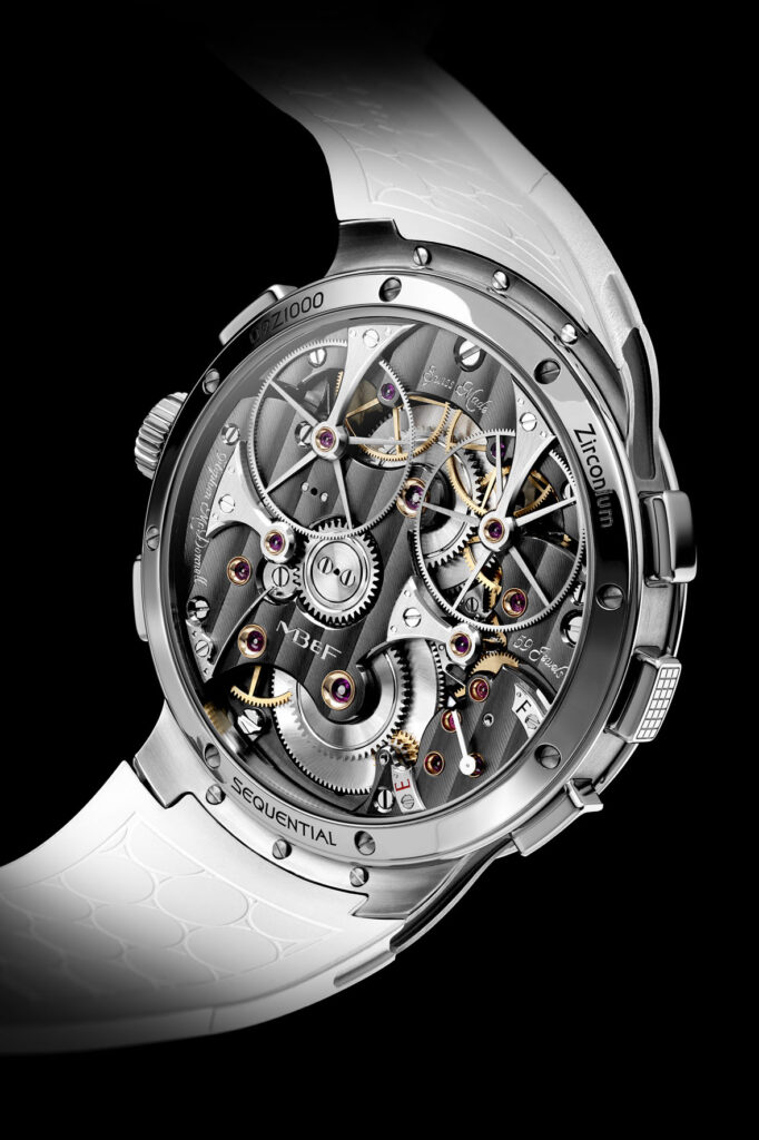 La maggior parte degli altri cronografi di alto livello, progettati per incrementare l’utilizzo del cronografo, adattano il meccanismo a situazioni altamente specifiche e orientate allo sport. Al contrario, la LM Sequential EVO è progettata per rispondere alle esigenze della vita quotidiana e adattarsi a contesti che sperimentiamo tutti. La cassa 44mm in zirconio, gli 80 metri di impermeabilità e il sistema di smorzamento interno “FlexRing” conferiscono una resilienza senza precedenti a questo movimento estremamente complesso. È l’insieme di tutti questi elementi a rendere la collezione “EVO” una casa naturale per il primo cronografo di MB&F, realizzato con la volontà di portare avanti l’identità del primo esemplare EVO, la LM Perpetual EVO, presentato nel 2020 con il messaggio: “non un orologio per lo sport, un orologio per la vita”. (Prezzo CHF 160.000 + IVA)