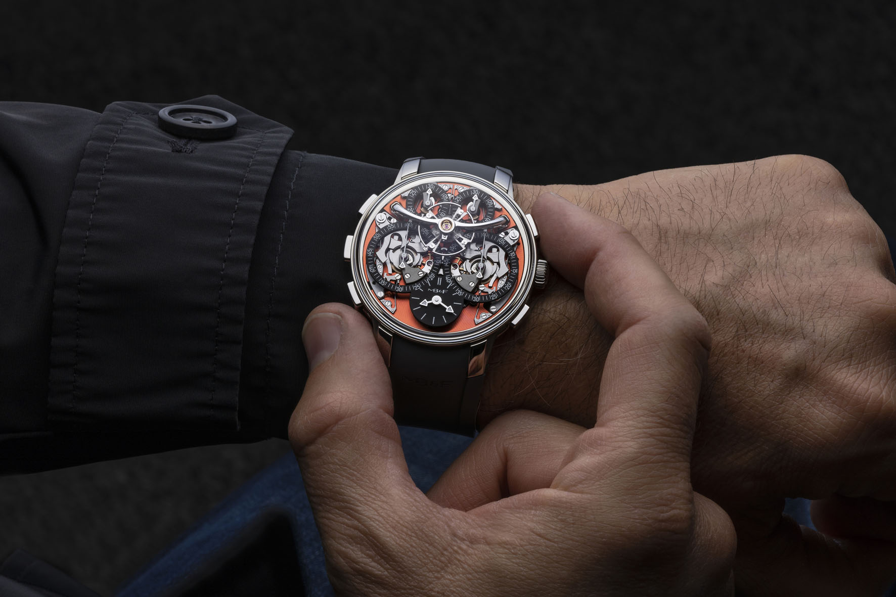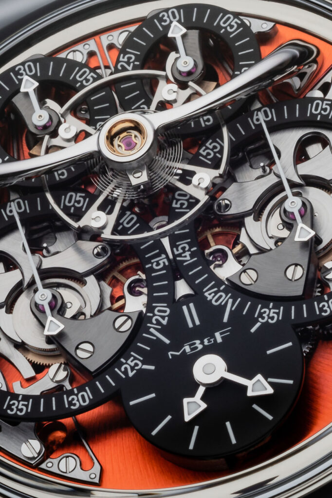 Il quadrante della LM Sequential EVO, disponibile in arancione o nero, presenta due display dedicati al cronografo. Sul primo, la visualizzazione dei secondi è a ore 9 e quella dei minuti a ore 11. Sul secondo, la visualizzazione dei secondi è a ore 3 e quella dei minuti all’1. Ciascuno dei display può essere avviato, arrestato e resettato completamente indipendentemente dall’altro, utilizzando i pulsanti start/stop e reset sui corrispondenti lati della cassa. Questi sono i quattro pulsanti che normalmente si assocerebbero ai due meccanismi del cronografo racchiusi in un orologio.